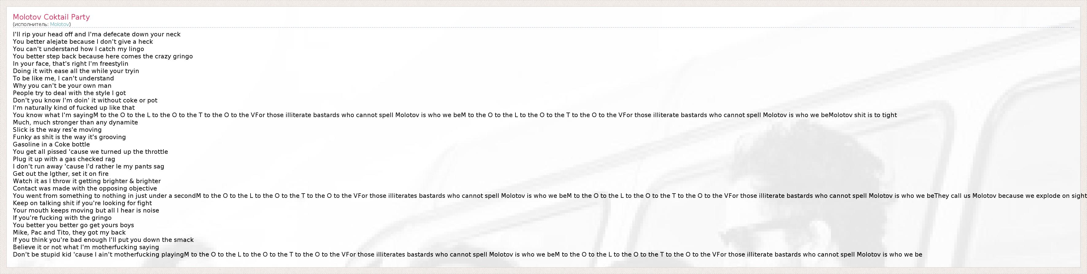 You know what I'm sayingM to the O to the L to the O to the T to the O to the VFor those illiterate bastards who cannot spell Molotov is who we beM to the O to the L to the O to the T to the O to the VFor those illiterate bastards who cannot spell Molotov is who we beMolotov shit is to tight