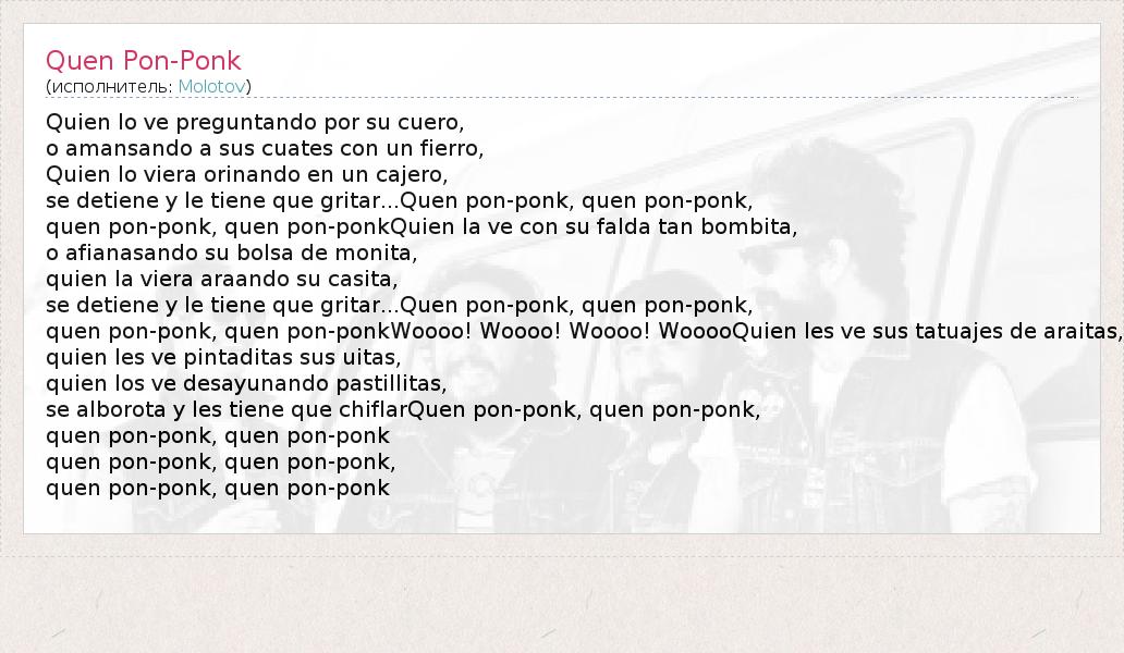 Это интересно:Мексиканская рэпкор-банда с вовсе не русским названием "Molotov" была образована в сентябре 1995 года. В первоначальный состав вошли Микки Хайдобро (бас), Тито Фуэнтес (вокал, гитара), Джавье Де Ла Куэва (бас) и парень по кличке "Ла Куэсадиллера" (ударные). Этот барабанщик не пробыл в команде и месяца и уже в октябре уступил место Рэнди Эбрайту. Де Ла Куэва продержался подольше, но в феврале... продолжение
