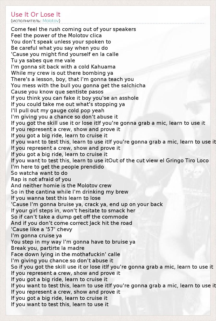 Come feel the rush coming out of your speakers Feel the power of the Molotov clica You don't speak unless your spoken to Be careful what you say when you do 'Cause you might find yourself en la calle Tu ya sabes que me vale I'm gonna sit back with a cold Kahuama While my crew is out there bombing ya There's a lesson, boy, that I'm gonna teach you You mess with the bull you gonna get the salchicha Cause you know que sentiste pasos If you think you can fake it boy you'se an asshole If you could take me out what's stopping ya I'll pull out my gauge cold pop yeah I'm giving you a chance so don't abuse it If you got the skill use it or lose itIf you're gonna grab a mic, learn to use it If you represent a crew, show and prove it If you got a big ride, learn to cruise it If you want to test this, learn to use itIf you're gonna grab a mic, learn to use it If you represent a crew, show and prove it If you got a big ride, learn to cruise it If you want to test this, learn to use itOut of the cut view el Gringo Tiro Loco I'm here to get the people prendido So watcha want to do Rap is not afraid of you And neither homie is the Molotov crew So in the cantina while I'm drinking my brew If you wanna test this learn to lose 'Cause I'm gonna bruise ya, crack ya, end up on your back If your girl steps in, won't hesitate to smack her So if can't take a dump get off the commode And if you don't come correct Jack hit the road 'Cause like a '57' chevy I'm gonna cruise ya You step in my way I'm gonna have to bruise ya Break you, partirte la madre Face down lying in the mothafuckin' calle I'm giving you chance so don't abuse it So if you got the skill use it or lose itIf you're gonna grab a mic, learn to use it If you represent a crew, show and prove it If you got a big ride, learn to cruise it If you want to test this, learn to use itIf you're gonna grab a mic, learn to use it If you represent a crew, show and prove it If you got a big ride, learn to cruise it If you want to test this, learn to use it