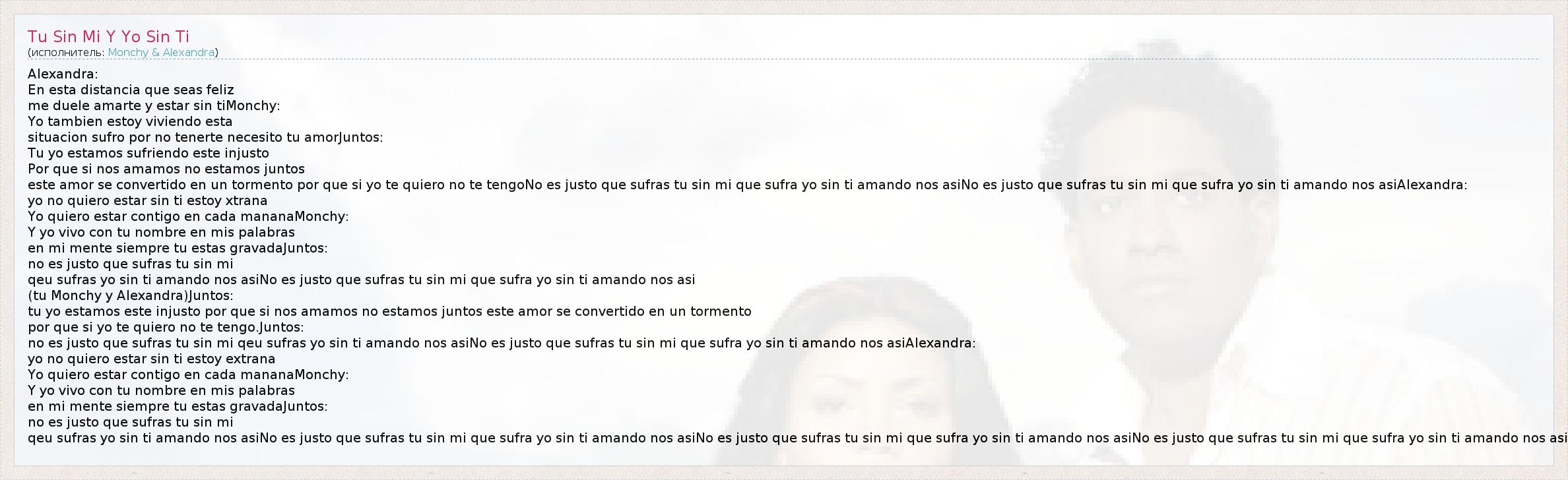 no es justo que sufras tu sin mi qeu sufras yo sin ti amando nos asiNo es justo que sufras tu sin mi que sufra yo sin ti amando nos asiAlexandra: