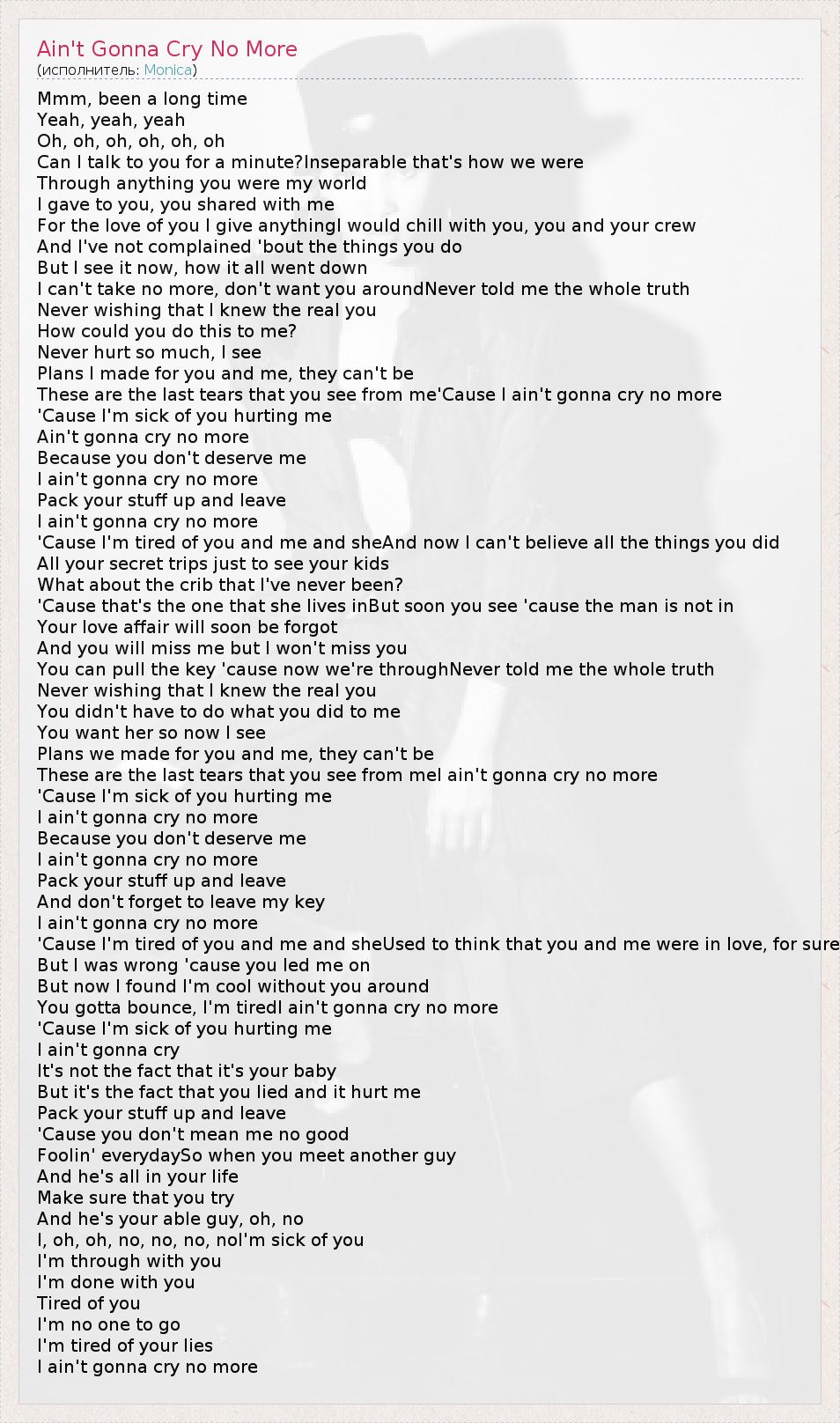 А как ты думаешь, о чем песня "Ain't Gonna Cry No More" ?