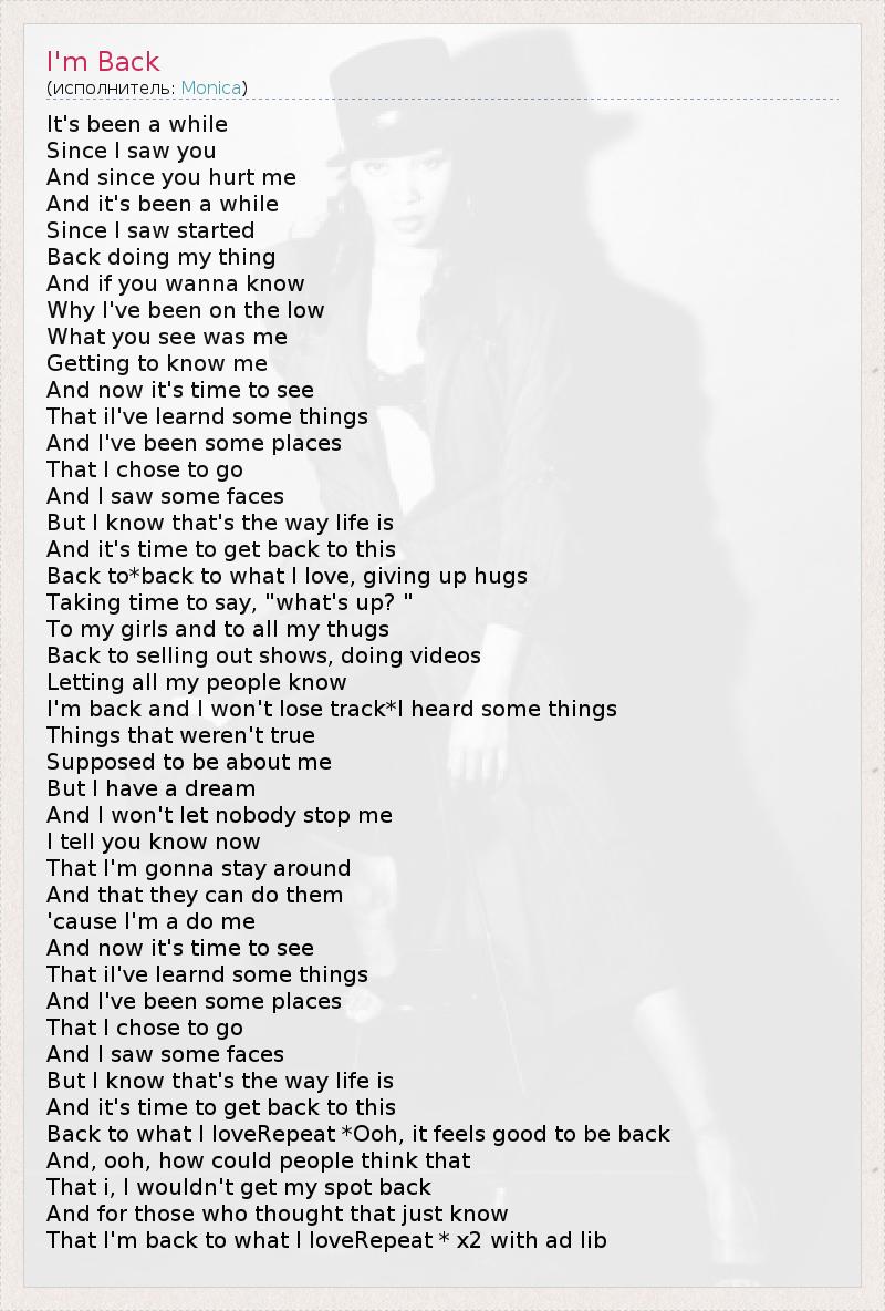It's been a while Since I saw you And since you hurt me And it's been a while Since I saw started Back doing my thing And if you wanna know Why I've been on the low What you see was me Getting to know me And now it's time to see That iI've learnd some things And I've been some places That I chose to go And I saw some faces But I know that's the way life is And it's time to get back to this Back to*back to what I love, giving up hugs Taking time to say, "what's up? " To my girls and to all my thugs Back to selling out shows, doing videos Letting all my people know I'm back and I won't lose track*I heard some things Things that weren't true Supposed to be about me But I have a dream And I won't let nobody stop me I tell you know now That I'm gonna stay around And that they can do them 'cause I'm a do me And now it's time to see That iI've learnd some things And I've been some places That I chose to go And I saw some faces But I know that's the way life is And it's time to get back to this Back to what I loveRepeat *Ooh, it feels good to be back And, ooh, how could people think that That i, I wouldn't get my spot back And for those who thought that just know That I'm back to what I loveRepeat * x2 with ad lib
