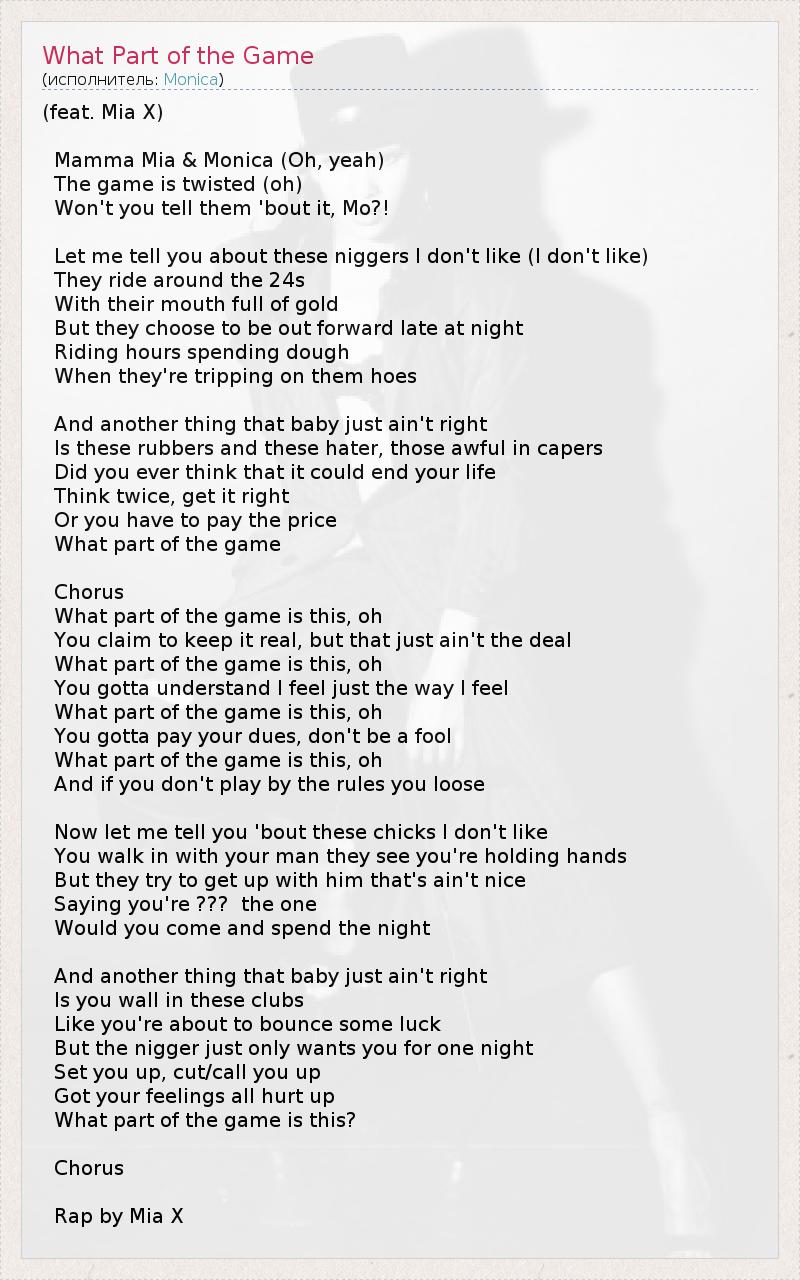 (feat. Mia X) Mamma Mia & Monica (Oh, yeah) The game is twisted (oh) Won't you tell them 'bout it, Mo?! Let me tell you about these niggers I don't like (I don't like) They ride around the 24s With their mouth full of gold But they choose to be out forward late at night Riding hours spending dough When they're tripping on them hoes And another thing that baby just ain't right Is these rubbers and these hater, those awful in capers Did you ever think that it could end your life Think twice, get it right Or you have to pay the price What part of the game Chorus What part of the game is this, oh You claim to keep it real, but that just ain't the deal What part of the game is this, oh You gotta understand I feel just the way I feel What part of the game is this, oh You gotta pay your dues, don't be a fool What part of the game is this, oh And if you don't play by the rules you loose Now let me tell you 'bout these chicks I don't like You walk in with your man they see you're holding hands But they try to get up with him that's ain't nice Saying you're ??? the one Would you come and spend the night And another thing that baby just ain't right Is you wall in these clubs Like you're about to bounce some luck But the nigger just only wants you for one night Set you up, cut/call you up Got your feelings all hurt up What part of the game is this? Chorus Rap by Mia X