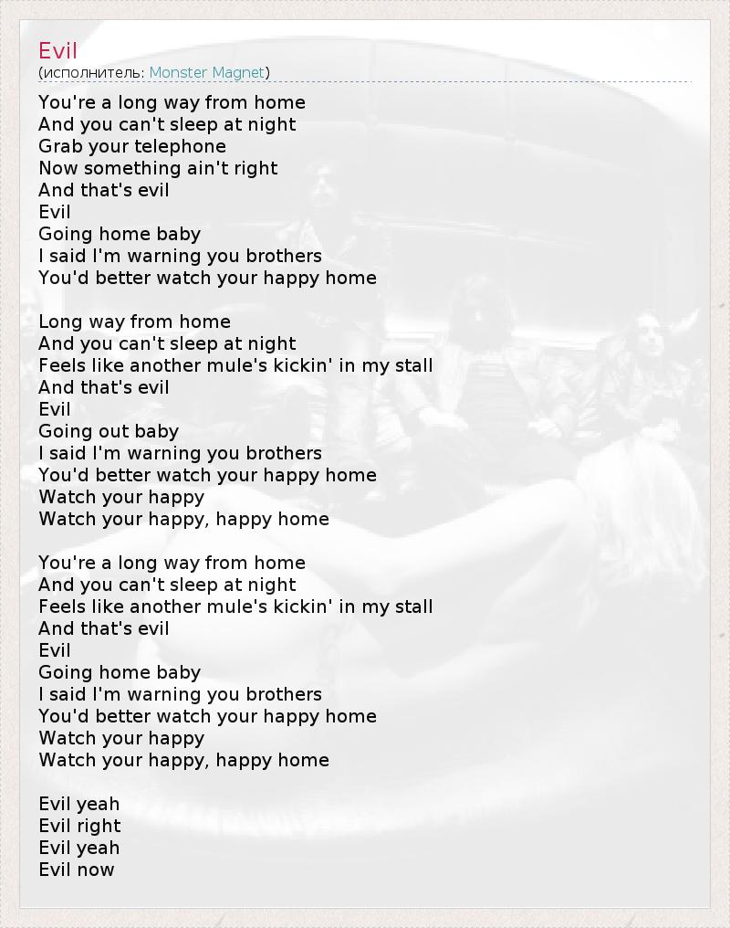 You're a long way from home And you can't sleep at night Grab your telephone Now something ain't right And that's evil Evil Going home baby I said I'm warning you brothers You'd better watch your happy home Long way from home And you can't sleep at night Feels like another mule's kickin' in my stall And that's evil Evil Going out baby I said I'm warning you brothers You'd better watch your happy home Watch your happy Watch your happy, happy home You're a long way from home And you can't sleep at night Feels like another mule's kickin' in my stall And that's evil Evil Going home baby I said I'm warning you brothers You'd better watch your happy home Watch your happy Watch your happy, happy home Evil yeah Evil right Evil yeah Evil now