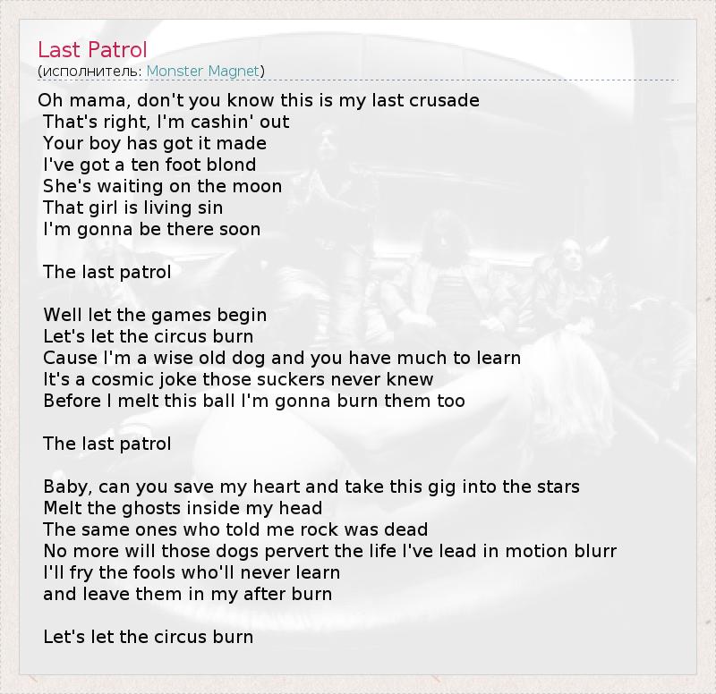 Oh mama, don't you know this is my last crusade That's right, I'm cashin' out Your boy has got it made I've got a ten foot blond She's waiting on the moon That girl is living sin I'm gonna be there soon The last patrol Well let the games begin Let's let the circus burn Cause I'm a wise old dog and you have much to learn It's a cosmic joke those suckers never knew Before I melt this ball I'm gonna burn them too The last patrol Baby, can you save my heart and take this gig into the stars Melt the ghosts inside my head The same ones who told me rock was dead No more will those dogs pervert the life I've lead in motion blurr I'll fry the fools who'll never learn and leave them in my after burn Let's let the circus burn