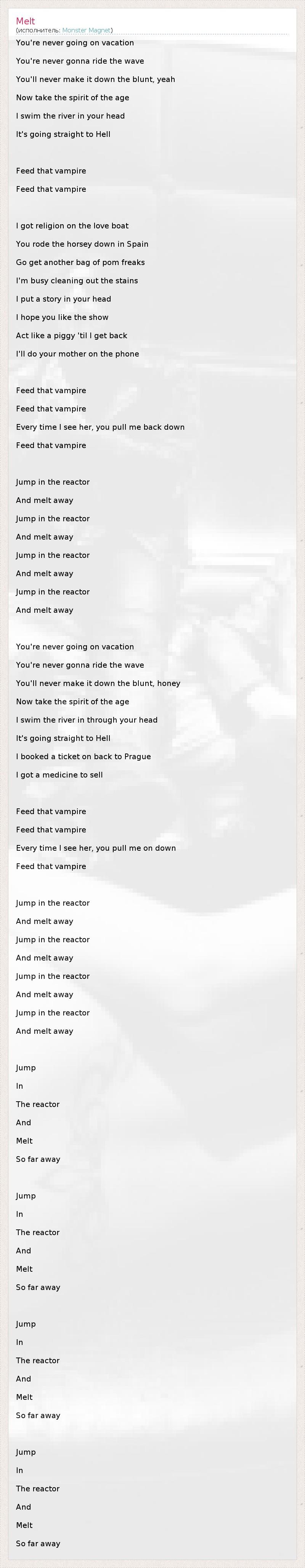 You're never going on vacation You're never gonna ride the wave You'll never make it down the blunt, yeah Now take the spirit of the age I swim the river in your head It's going straight to Hell Feed that vampire Feed that vampire I got religion on the love boat You rode the horsey down in Spain Go get another bag of pom freaks I'm busy cleaning out the stains I put a story in your head I hope you like the show Act like a piggy 'til I get back I'll do your mother on the phone Feed that vampire Feed that vampire Every time I see her, you pull me back down Feed that vampire Jump in the reactor And melt away Jump in the reactor And melt away Jump in the reactor And melt away Jump in the reactor And melt away You're never going on vacation You're never gonna ride the wave You'll never make it down the blunt, honey Now take the spirit of the age I swim the river in through your head It's going straight to Hell I booked a ticket on back to Prague I got a medicine to sell Feed that vampire Feed that vampire Every time I see her, you pull me on down Feed that vampire Jump in the reactor And melt away Jump in the reactor And melt away Jump in the reactor And melt away Jump in the reactor And melt away Jump In The reactor And Melt So far away Jump In The reactor And Melt So far away Jump In The reactor And Melt So far away Jump In The reactor And Melt So far away