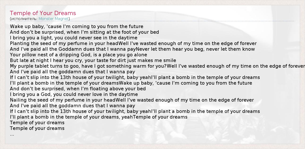 Wake up baby, 'cause I'm coming to you from the future And don't be surprised, when I'm sitting at the foot of your bed I bring you a light, you could never see in the daytime Planting the seed of my perfume in your headWell I've wasted enough of my time on the edge of forever And I've paid all the Goddamn dues that I wanna payNever let them hear you beg, never let them know Your pillow nest of a dripping God, is a place you go alone But late at night I hear you cry, your taste for dirt just makes me smile My purple tablet turns to goo, have I got something warm for you?Well I've wasted enough of my time on the edge of forever And I've paid all the goddamn dues that I wanna pay If I can't slip into the 13th house of your twilight, baby yeahI'll plant a bomb in the temple of your dreams I'll plant a bomb in the temple of your dreamsWake up baby, 'cause I'm coming to you from the future And don't be surprised, when I'm floating above your bed I bring you a God, you could never love in the daytime Nailing the seed of my perfume in your headWell I've wasted enough of my time on the edge of forever And I've paid all the goddamn dues that I wanna pay If I can't slip into the 13th house of your twilight, baby yeahI'll plant a bomb in the temple of your dreams I'll plant a bomb in the temple of your dreams, yeahTemple of your dreams Temple of your dreams Temple of your dreams ...