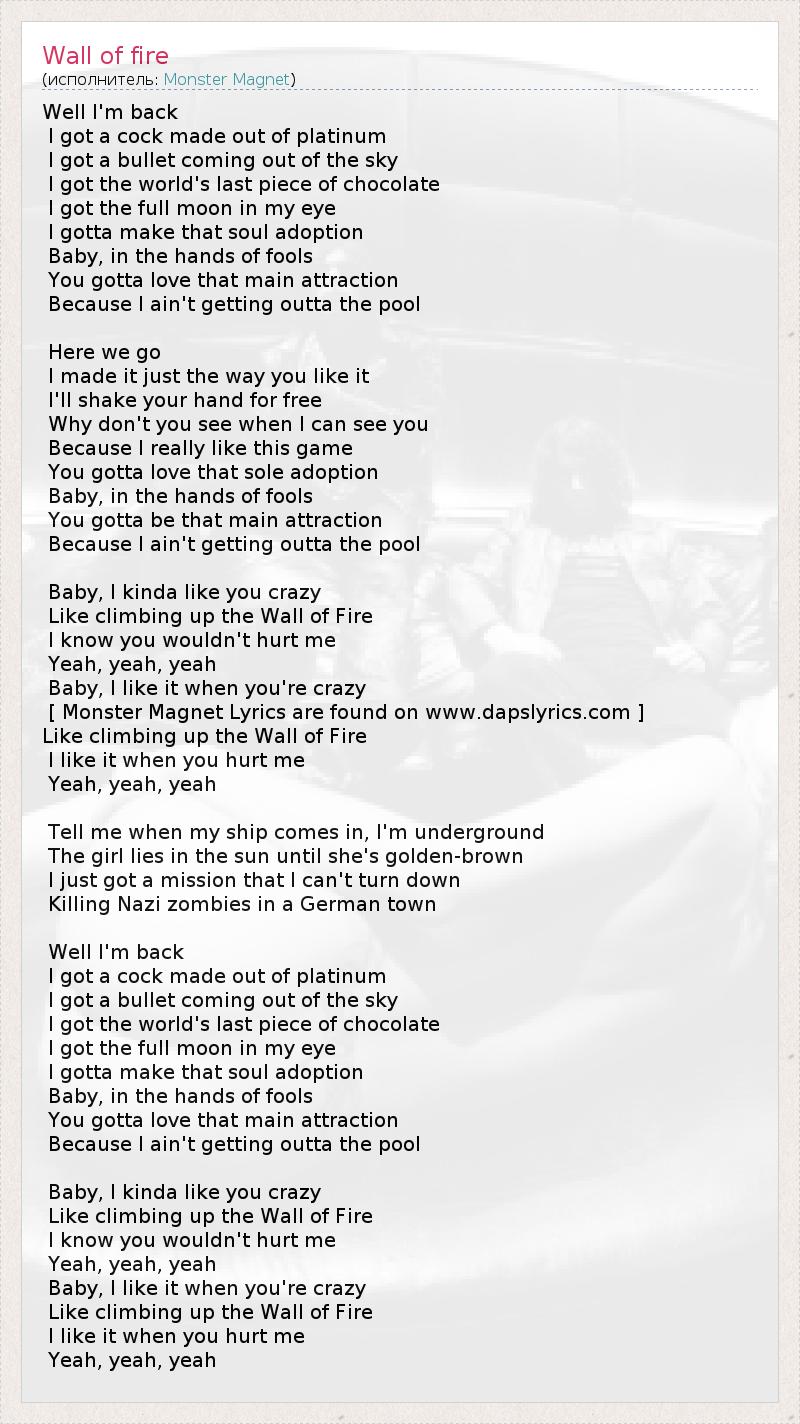 Well I'm back I got a cock made out of platinum I got a bullet coming out of the sky I got the world's last piece of chocolate I got the full moon in my eye I gotta make that soul adoption Baby, in the hands of fools You gotta love that main attraction Because I ain't getting outta the pool Here we go I made it just the way you like it I'll shake your hand for free Why don't you see when I can see you Because I really like this game You gotta love that sole adoption Baby, in the hands of fools You gotta be that main attraction Because I ain't getting outta the pool Baby, I kinda like you crazy Like climbing up the Wall of Fire I know you wouldn't hurt me Yeah, yeah, yeah Baby, I like it when you're crazy [ Monster Magnet Lyrics are found on www.dapslyrics.com ] Like climbing up the Wall of Fire I like it when you hurt me Yeah, yeah, yeah Tell me when my ship comes in, I'm underground The girl lies in the sun until she's golden-brown I just got a mission that I can't turn down Killing Nazi zombies in a German town Well I'm back I got a cock made out of platinum I got a bullet coming out of the sky I got the world's last piece of chocolate I got the full moon in my eye I gotta make that soul adoption Baby, in the hands of fools You gotta love that main attraction Because I ain't getting outta the pool Baby, I kinda like you crazy Like climbing up the Wall of Fire I know you wouldn't hurt me Yeah, yeah, yeah Baby, I like it when you're crazy Like climbing up the Wall of Fire I like it when you hurt me Yeah, yeah, yeah