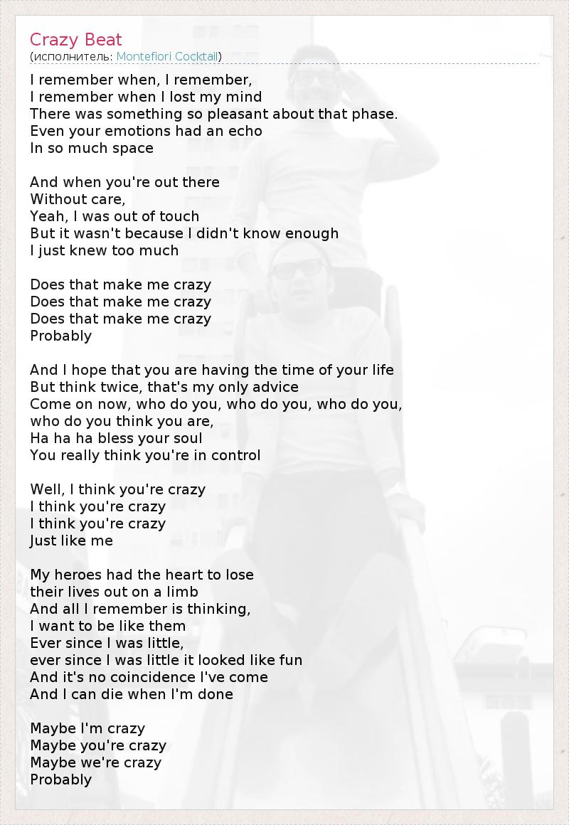 Я помню, когда… Я помню… Я помню, когда я сошёл с ума, В этом состоянии было даже что-то приятное. Даже твои эмоции отражались эхом В безграничном пространстве. Когда ты где-то там, Далеко от забот… Да, я не имел представления ни о чём, Но не потому, что я ничего не знал, А совсем наоборот, я знал слишком много… Разве это делает меня сумасшедшим? Разве это делает меня сумасшедшим? Разве это делает меня сумасшедшим? Возможно… Надеюсь, ты наслаждаешься жизнью. Но, мой совет тебе, не принимай скоропалительных решений. Ты, кого ты, кого ты, Кого ты из себя возомнил? Ха-ха-ха, Господь с тобой, Ты, правда, думаешь, что ты в своём уме! А я думаю, что ты сумасшедший. Я думаю, что ты сумасшедший. Я думаю, что ты сумасшедший, Совсем как я. Моим героям хватало смелости Рисковать жизнью и умирать. И я помню лишь то, Как хотел быть похожим на них. Впоследствии всю жизнь… Впоследствии всю жизнь мне казалось это забавным. Нет ничего случайного в том, что я пришёл в этот мир. И я умру, когда выполню своё предназначение. Возможно, я сумасшедший, Возможно, ты сумасшедший, Возможно, мы сумасшедшие… Возможно…
