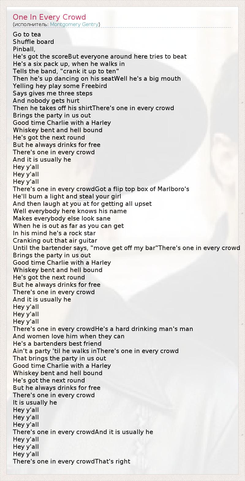 Go to tea Shuffle board Pinball, He's got the scoreBut everyone around here tries to beat He's a six pack up, when he walks in Tells the band, "crank it up to ten" Then he's up dancing on his seatWell he's a big mouth Yelling hey play some Freebird Says gives me three steps And nobody gets hurt Then he takes off his shirtThere's one in every crowd Brings the party in us out Good time Charlie with a Harley Whiskey bent and hell bound He's got the next round But he always drinks for free There's one in every crowd And it is usually he Hey y'all Hey y'all Hey y'all There's one in every crowdGot a flip top box of Marlboro's He'll bum a light and steal your girl And then laugh at you at for getting all upset Well everybody here knows his name Makes everybody else look sane When he is out as far as you can get In his mind he's a rock star Cranking out that air guitar Until the bartender says, "move get off my bar"There's one in every crowd Brings the party in us out Good time Charlie with a Harley Whiskey bent and hell bound He's got the next round But he always drinks for free There's one in every crowd And it is usually he Hey y'all Hey y'all Hey y'all There's one in every crowdHe's a hard drinking man's man And women love him when they can He's a bartenders best friend Ain't a party 'til he walks inThere's one in every crowd That brings the party in us out Good time Charlie with a Harley Whiskey bent and hell bound He's got the next round But he always drinks for free There's one in every crowd It is usually he Hey y'all Hey y'all Hey y'all There's one in every crowdAnd it is usually he Hey y'all Hey y'all Hey y'all There's one in every crowdThat's right