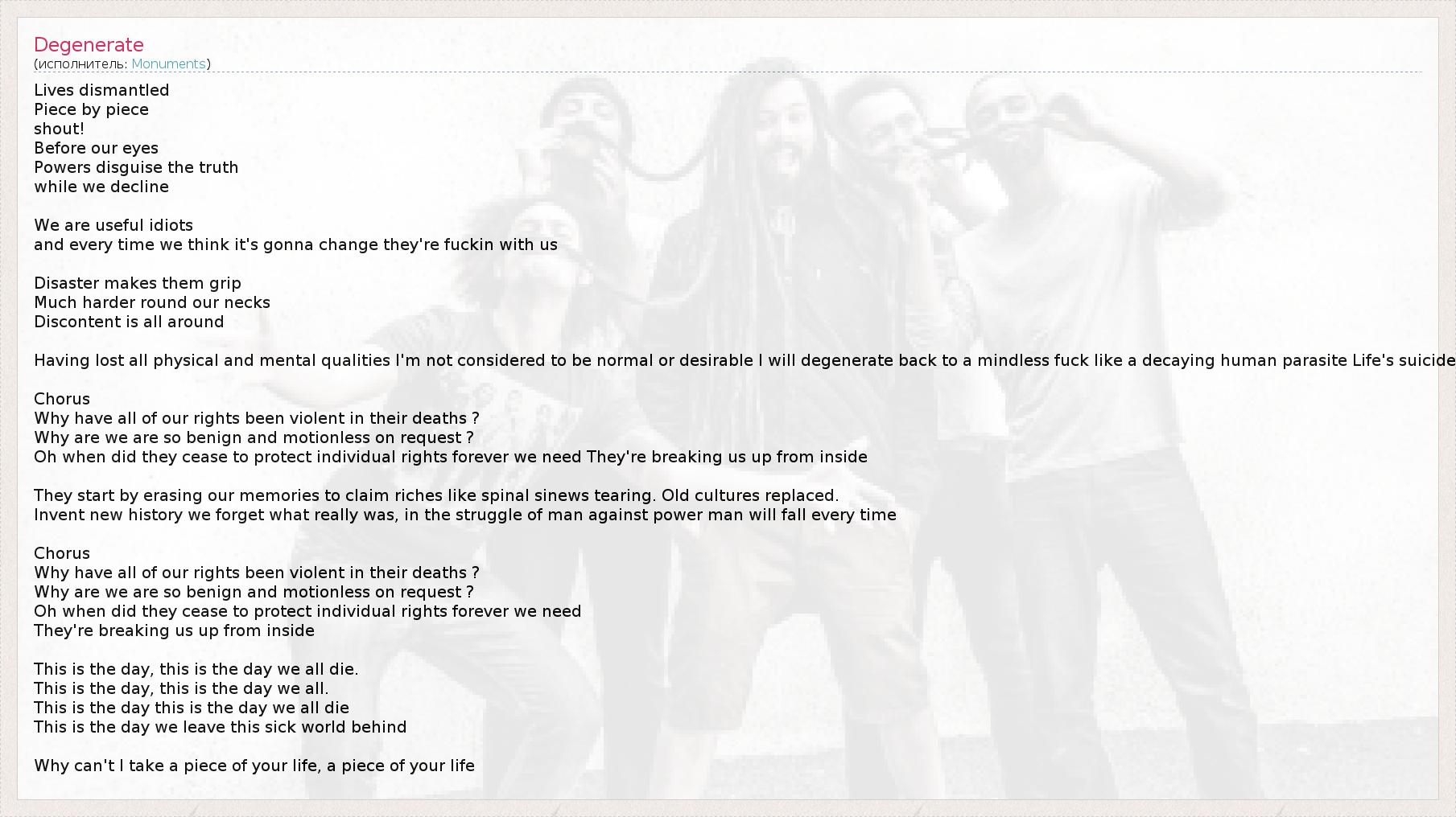 Живет демонтированы По кускам кричать! Перед нашими глазами Полномочия замаскировать правду в то время как мы отказываемся Мы полезные идиоты и каждый раз мы думаем, что собирается изменить они чертовски с нами Стихийных бедствий делает их сцепление Гораздо сложнее круглый наших шеях Недовольство все вокруг Потеряв все физические и психические качества, я не считается нормальным или желательным я выродится вернуться к бессмысленному трахаются как самоубийство распадающейся человеческой паразита Жизни Хор Почему все наши права были жестокими в их смерти? Почему мы так доброкачественные и неподвижно на запрос? О, когда они перестают защищать индивидуальные права навсегда мы должны Они нарушают нас изнутри Они начинают стирать наши воспоминания утверждают богатство как спинного сухожилий разрыва. Старые культуры заменить. Придумайте новую историю, мы забыли, что на самом деле, в борьбе человека против власти человека упадет каждый раз Хор Почему все наши права были жестокими в их смерти? Почему мы так доброкачественные и неподвижно на запрос? О, когда они перестают защищать индивидуальные права навсегда мы должны Они нарушают нас изнутри Это день, это день, когда мы все умрем. Это день, это день, когда мы все. Это день это день, когда мы все умрем Это день, когда мы оставить этот мир позади больного Почему я не могу взять кусок вашей жизни, кусок вашей жизни