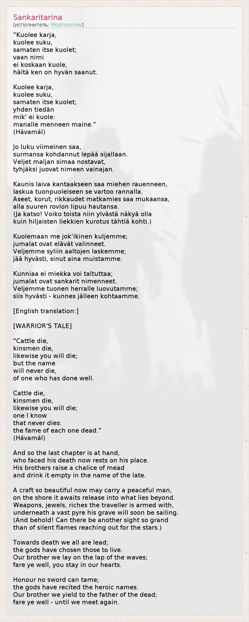 "Kuolee karja, kuolee suku, samaten itse kuolet; vaan nimi ei koskaan kuole, hältä ken on hyvän saanut. Kuolee karja, kuolee suku, samaten itse kuolet; yhden tiedän mik' ei kuole: manalle menneen maine." (Hávamál) Jo luku viimeinen saa, surmansa kohdannut lepää sijallaan. Veljet maljan simaa nostavat, tyhjäksi juovat nimeen vainajan. Kaunis laiva kantaakseen saa miehen rauenneen, laskua tuonpuoleiseen se vartoo rannalla. Aseet, korut, rikkaudet matkamies saa mukaansa, alla suuren rovion lipuu hautansa. (Ja katso! Voiko toista niin ylvästä näkyä olla kuin hiljaisten liekkien kurotus tähtiä kohti.) Kuolemaan me jok'ikinen kuljemme; jumalat ovat elävät valinneet. Veljemme syliin aaltojen laskemme; jää hyvästi, sinut aina muistamme. Kunniaa ei miekka voi taltuttaa; jumalat ovat sankarit nimenneet. Veljemme tuonen herralle luovutamme; siis hyvästi - kunnes jälleen kohtaamme. [English translation:] [WARRIOR'S TALE] "Cattle die, kinsmen die, likewise you will die; but the name will never die, of one who has done well. Cattle die, kinsmen die, likewise you will die; one I know that never dies: the fame of each one dead." (Hávamál) And so the last chapter is at hand, who faced his death now rests on his place. His brothers raise a chalice of mead and drink it empty in the name of the late. A craft so beautiful now may carry a peaceful man, on the shore it awaits release into what lies beyond. Weapons, jewels, riches the traveller is armed with, underneath a vast pyre his grave will soon be sailing. (And behold! Can there be another sight so grand than of silent flames reaching out for the stars.) Towards death we all are lead; the gods have chosen those to live. Our brother we lay on the lap of the waves; fare ye well, you stay in our hearts. Honour no sword can tame; the gods have recited the heroic names. Our brother we yield to the father of the dead; fare ye well - until we meet again.