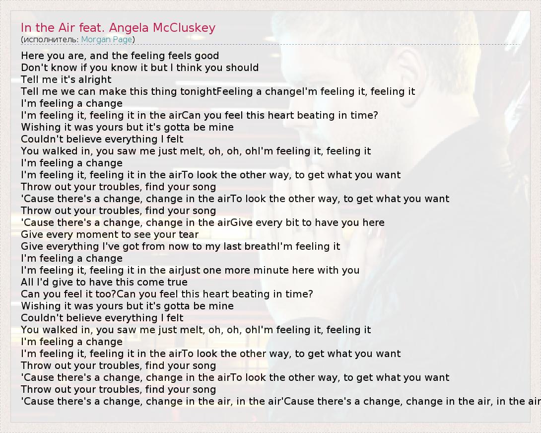 ГлавнаяИсполнителиMorgan PageIn the Air feat. Angela McCluskey