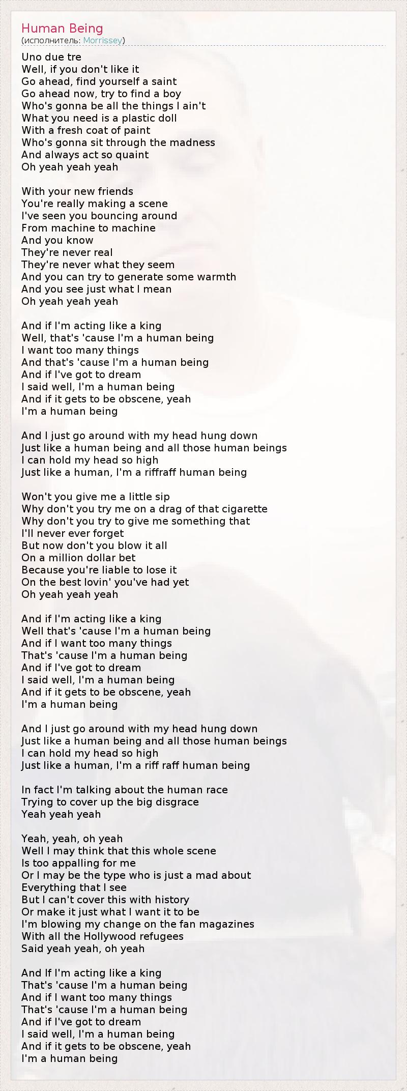 Uno due tre Well, if you don't like it Go ahead, find yourself a saint Go ahead now, try to find a boy Who's gonna be all the things I ain't What you need is a plastic doll With a fresh coat of paint Who's gonna sit through the madness And always act so quaint Oh yeah yeah yeah With your new friends You're really making a scene I've seen you bouncing around From machine to machine And you know They're never real They're never what they seem And you can try to generate some warmth And you see just what I mean Oh yeah yeah yeah And if I'm acting like a king Well, that's 'cause I'm a human being I want too many things And that's 'cause I'm a human being And if I've got to dream I said well, I'm a human being And if it gets to be obscene, yeah I'm a human being And I just go around with my head hung down Just like a human being and all those human beings I can hold my head so high Just like a human, I'm a riffraff human being Won't you give me a little sip Why don't you try me on a drag of that cigarette Why don't you try to give me something that I'll never ever forget But now don't you blow it all On a million dollar bet Because you're liable to lose it On the best lovin' you've had yet Oh yeah yeah yeah And if I'm acting like a king Well that's 'cause I'm a human being And if I want too many things That's 'cause I'm a human being And if I've got to dream I said well, I'm a human being And if it gets to be obscene, yeah I'm a human being And I just go around with my head hung down Just like a human being and all those human beings I can hold my head so high Just like a human, I'm a riff raff human being In fact I'm talking about the human race Trying to cover up the big disgrace Yeah yeah yeah Yeah, yeah, oh yeah Well I may think that this whole scene Is too appalling for me Or I may be the type who is just a mad about Everything that I see But I can't cover this with history Or make it just what I want it to be I'm blowing my change on the fan magazines With all the Hollywood refugees Said yeah yeah, oh yeah And If I'm acting like a king That's 'cause I'm a human being And if I want too many things That's 'cause I'm a human being And if I've got to dream I said well, I'm a human being And if it gets to be obscene, yeah I'm a human being