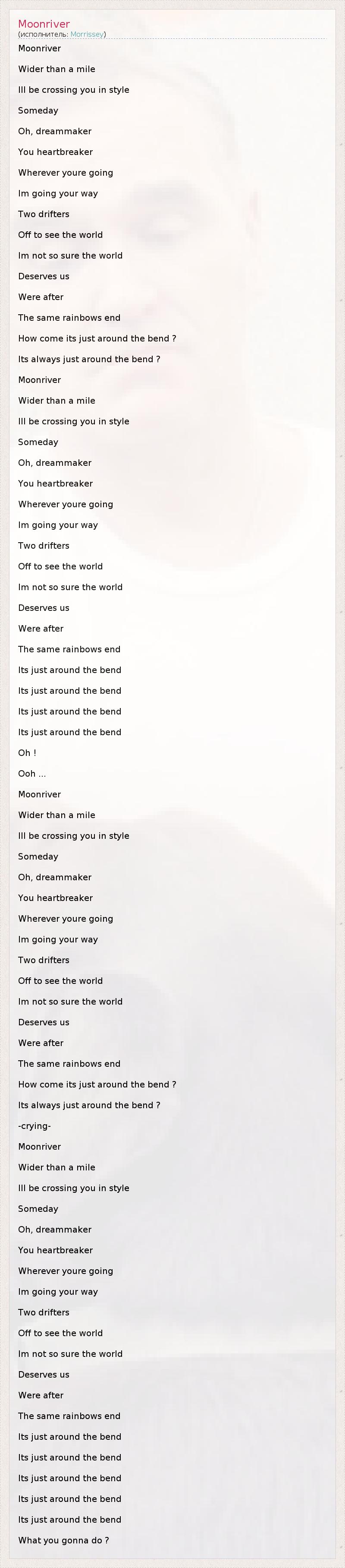 Это интересно:Стивен Патрик Моррисси (родился 22 мая 1959 года в Манчестере) — английский поэт и музыкант. В 1982—1987 — солист влиятельной британской инди-группы The Smiths, которую он основал совместно с гитаристом Джонни Марром. После распада The Smiths Моррисси начал сольную карьеру, успешно продолжающуюся по сей день.Моррисси — икона альтернативного рока, самый умный, самый непонятый,... продолжение