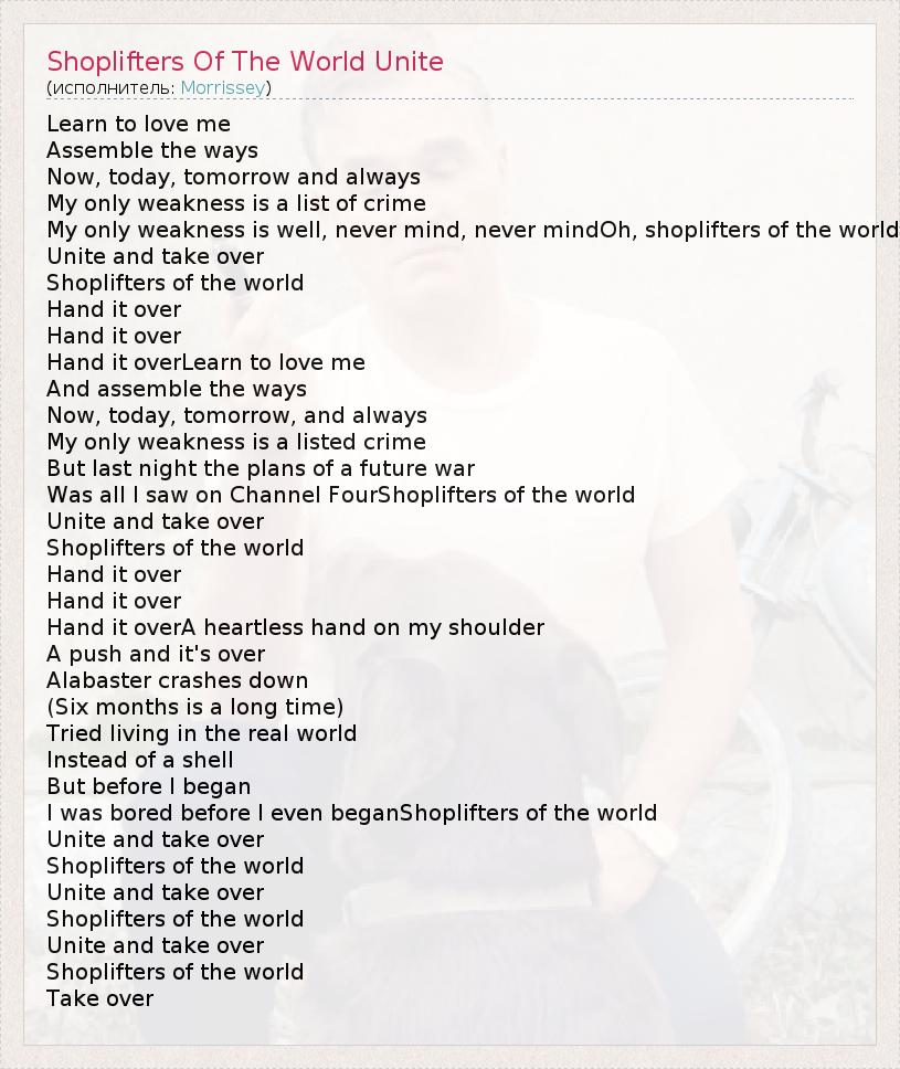 Learn to love me Assemble the ways Now, today, tomorrow and always My only weakness is a list of crime My only weakness is well, never mind, never mindOh, shoplifters of the world Unite and take over Shoplifters of the world Hand it over Hand it over Hand it overLearn to love me And assemble the ways Now, today, tomorrow, and always My only weakness is a listed crime But last night the plans of a future war Was all I saw on Channel FourShoplifters of the world Unite and take over Shoplifters of the world Hand it over Hand it over Hand it overA heartless hand on my shoulder A push and it's over Alabaster crashes down (Six months is a long time) Tried living in the real world Instead of a shell But before I began I was bored before I even beganShoplifters of the world Unite and take over Shoplifters of the world Unite and take over Shoplifters of the world Unite and take over Shoplifters of the world Take over