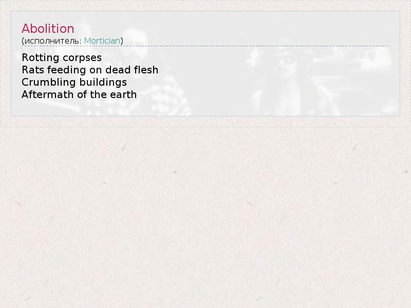 Это интересно:Американская дэз-грайндовая группа Mortician образовалась в 1989 году и сначала называлась Casket. В состав группы входило всего два человека: Уилл Рамер (вокал, бас) и Мэтт Сичер (ударные). После записи композиции "Mortician" было решено сменить название. В 1990 году группа записала свой накопившийся материал в формате демозаписи — "Demo 1", на которой на гитаре играл Джон МакЭнти из Incantation. В январе... продолжение