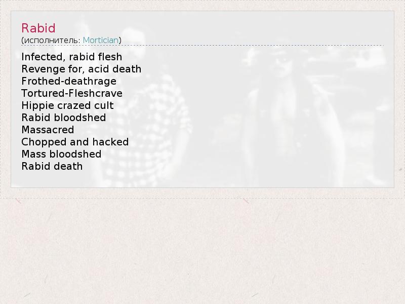 Это интересно:Американская дэз-грайндовая группа Mortician образовалась в 1989 году и сначала называлась Casket. В состав группы входило всего два человека: Уилл Рамер (вокал, бас) и Мэтт Сичер (ударные). После записи композиции "Mortician" было решено сменить название. В 1990 году группа записала свой накопившийся материал в формате демозаписи — "Demo 1", на которой на гитаре играл Джон МакЭнти из Incantation. В январе... продолжение