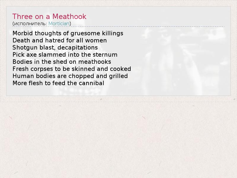 А как ты думаешь, о чем песня "Three on a Meathook" ?