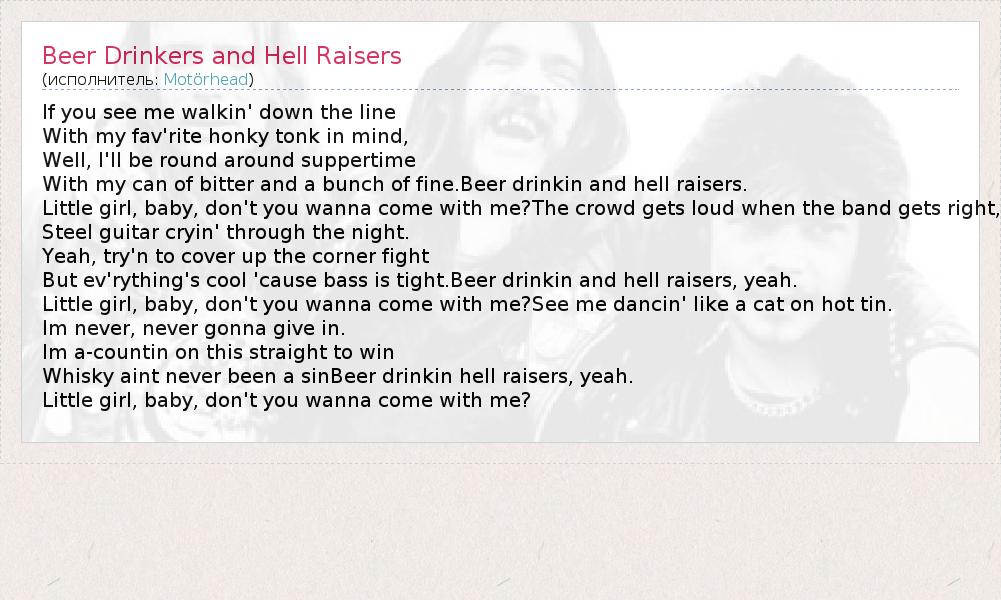 А как ты думаешь, о чем песня "Beer Drinkers and Hell Raisers" ?
