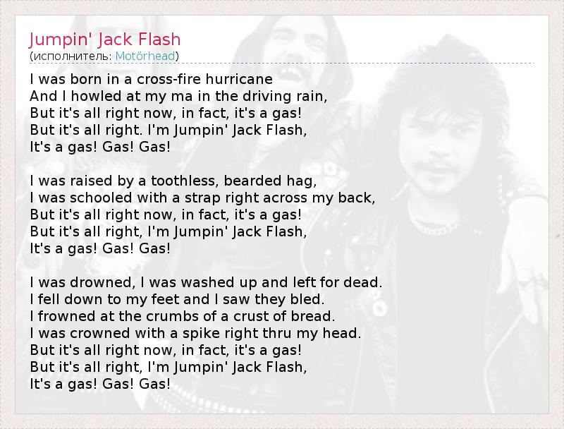 I was born in a cross-fire hurricane And I howled at my ma in the driving rain, But it's all right now, in fact, it's a gas! But it's all right. I'm Jumpin' Jack Flash, It's a gas! Gas! Gas! I was raised by a toothless, bearded hag, I was schooled with a strap right across my back, But it's all right now, in fact, it's a gas! But it's all right, I'm Jumpin' Jack Flash, It's a gas! Gas! Gas! I was drowned, I was washed up and left for dead. I fell down to my feet and I saw they bled. I frowned at the crumbs of a crust of bread. I was crowned with a spike right thru my head. But it's all right now, in fact, it's a gas! But it's all right, I'm Jumpin' Jack Flash, It's a gas! Gas! Gas!