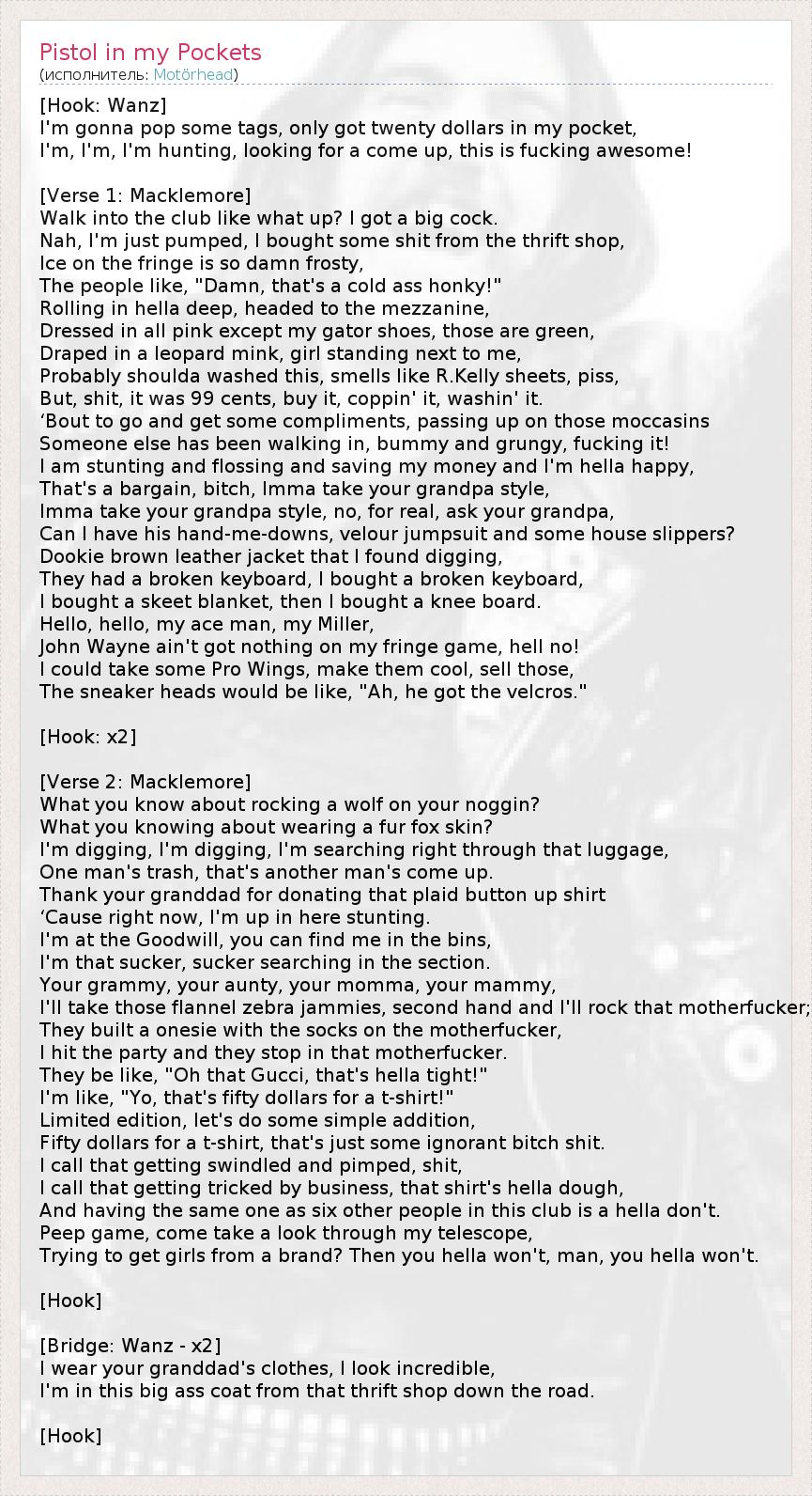 А как ты думаешь, о чем песня "Pistol in my Pockets" ?