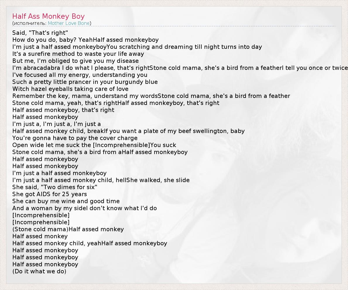 Said, "That's right" How do you do, baby? YeahHalf assed monkeyboy I'm just a half assed monkeyboyYou scratching and dreaming till night turns into day It's a surefire method to waste your life away But me, I'm obliged to give you my disease I'm abracadabra I do what I please, that's rightStone cold mama, she's a bird from a featherI tell you once or twice I've focused all my energy, understanding you Such a pretty little prancer in your burgundy blue Witch hazel eyeballs taking care of love Remember the key, mama, understand my wordsStone cold mama, she's a bird from a feather Stone cold mama, yeah, that's rightHalf assed monkeyboy, that's right Half assed monkeyboy, that's right Half assed monkeyboy I'm just a, I'm just a, I'm just a Half assed monkey child, breakIf you want a plate of my beef swellington, baby You're gonna have to pay the cover charge Open wide let me suck the [Incomprehensible]You suck Stone cold mama, she's a bird from aHalf assed monkeyboy Half assed monkeyboy Half assed monkeyboy I'm just a half assed monkeyboy I'm just a half assed monkey child, hellShe walked, she slide She said, "Two dimes for six" She got AIDS for 25 years She can buy me wine and good time And a woman by my sideI don't know what I'd do [Incomprehensible] [Incomprehensible] (Stone cold mama)Half assed monkey Half assed monkey Half assed monkey child, yeahHalf assed monkeyboy Half assed monkeyboy Half assed monkeyboy Half assed monkeyboy (Do it what we do)