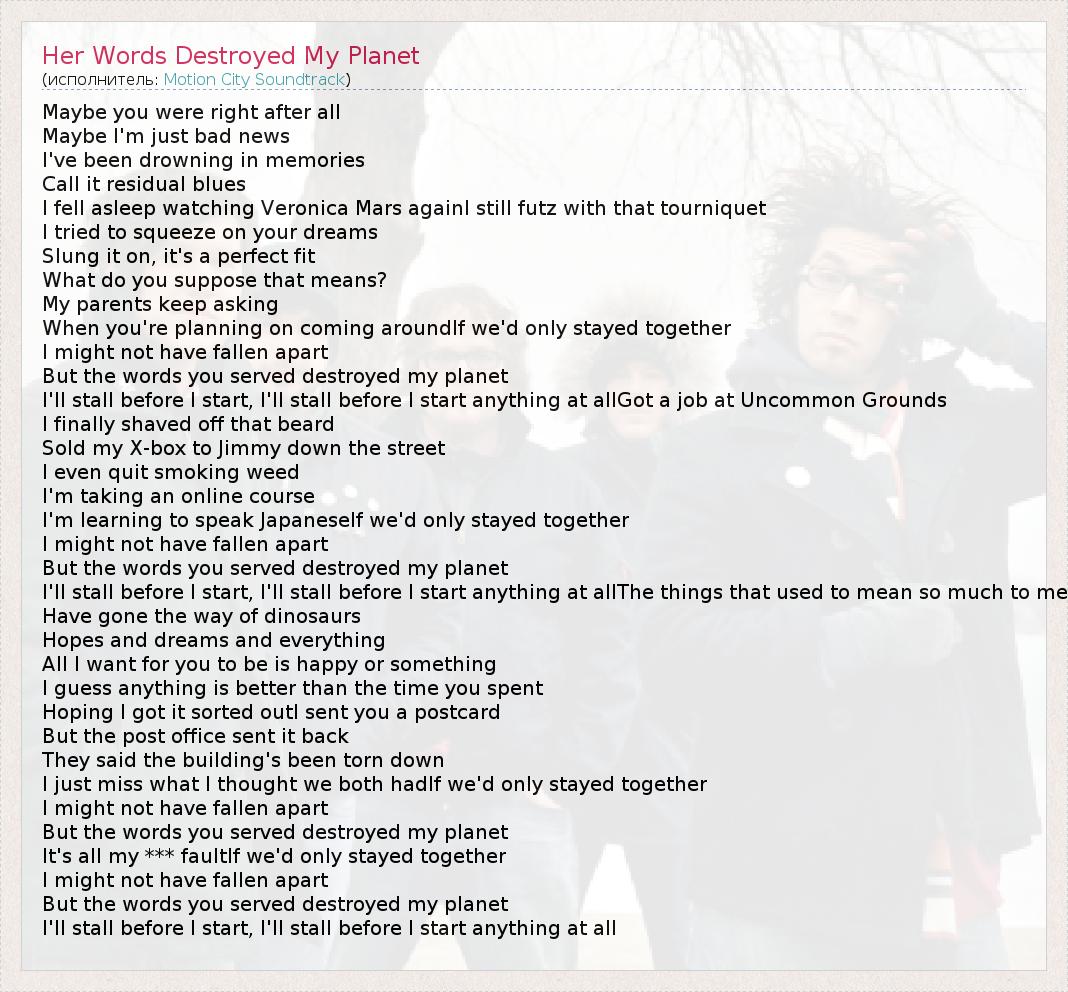 А как ты думаешь, о чем песня "Her Words Destroyed My Planet" ?