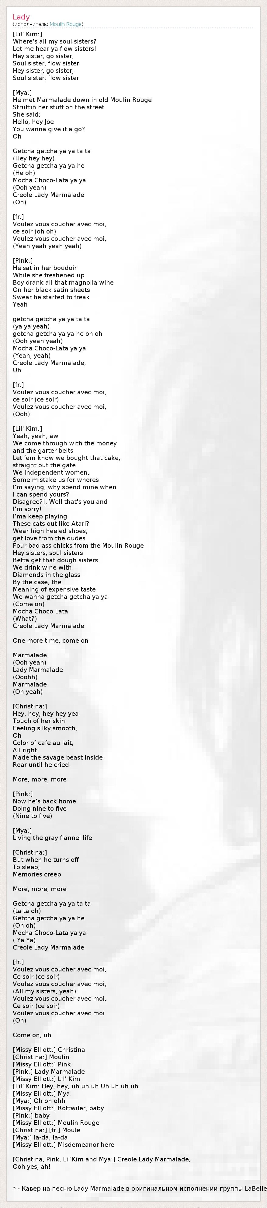 [Lil' Kim:] Where's all my soul sisters? Let me hear ya flow sisters! Hey sister, go sister, Soul sister, flow sister. Hey sister, go sister, Soul sister, flow sister [Mya:] He met Marmalade down in old Moulin Rouge Struttin her stuff on the street She said: Hello, hey Joe You wanna give it a go? Oh Getcha getcha ya ya ta ta (Hey hey hey) Getcha getcha ya ya he (He oh) Mocha Choco-Lata ya ya (Ooh yeah) Creole Lady Marmalade (Oh) [fr.] Voulez vous coucher avec moi, ce soir (oh oh) Voulez vous coucher avec moi, (Yeah yeah yeah yeah) [Pink:] He sat in her boudoir While she freshened up Boy drank all that magnolia wine On her black satin sheets Swear he started to freak Yeah getcha getcha ya ya ta ta (ya ya yeah) getcha getcha ya ya he oh oh (Ooh yeah yeah) Mocha Choco-Lata ya ya (Yeah, yeah) Creole Lady Marmalade, Uh [fr.] Voulez vous coucher avec moi, ce soir (ce soir) Voulez vous coucher avec moi, (Ooh) [Lil' Kim:] Yeah, yeah, aw We come through with the money and the garter belts Let ‘em know we bought that cake, straight out the gate We independent women, Some mistake us for whores I'm saying, why spend mine when I can spend yours? Disagree?!, Well that's you and I'm sorry! I'ma keep playing These cats out like Atari? Wear high heeled shoes, get love from the dudes Four bad ass chicks from the Moulin Rouge Hey sisters, soul sisters Betta get that dough sisters We drink wine with Diamonds in the glass By the case, the Meaning of expensive taste We wanna getcha getcha ya ya (Come on) Mocha Choco Lata (What?) Creole Lady Marmalade One more time, come on Marmalade (Ooh yeah) Lady Marmalade (Ooohh) Marmalade (Oh yeah) [Christina:] Hey, hey, hey hey yea Touch of her skin Feeling silky smooth, Oh Color of cafe au lait, All right Made the savage beast inside Roar until he cried More, more, more [Pink:] Now he's back home Doing nine to five (Nine to five) [Mya:] Living the gray flannel life [Christina:] But when he turns off To sleep, Memories creep More, more, more Getcha getcha ya ya ta ta (ta ta oh) Getcha getcha ya ya he (Oh oh) Mocha Choco-Lata ya ya ( Ya Ya) Creole Lady Marmalade [fr.] Voulez vous coucher avec moi, Ce soir (ce soir) Voulez vous coucher avec moi, (All my sisters, yeah) Voulez vous coucher avec moi, Ce soir (ce soir) Voulez vous coucher avec moi (Oh) Come on, uh [Missy Elliott:] Christina [Christina:] Moulin [Missy Elliott:] Pink [Pink:] Lady Marmalade [Missy Elliott:] Lil' Kim [Lil' Kim: Hey, hey, uh uh uh Uh uh uh uh [Missy Elliott:] Mya [Mya:] Oh oh ohh [Missy Elliott:] Rottwiler, baby [Pink:] baby [Missy Elliott:] Moulin Rouge [Christina:] [fr.] Moule [Mya:] la-da, la-da [Missy Elliott:] Misdemeanor here [Christina, Pink, Lil'Kim and Mya:] Creole Lady Marmalade, Ooh yes, ah! * - Кавер на песню Lady Marmalade в оригинальном исполнении группы LaBelle