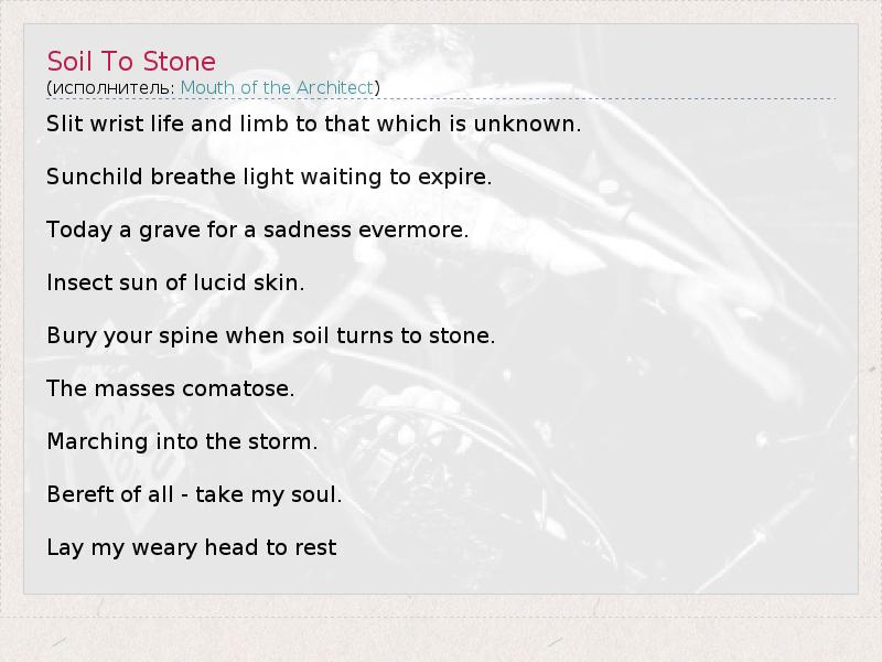 А как ты думаешь, о чем песня "Soil To Stone" ?