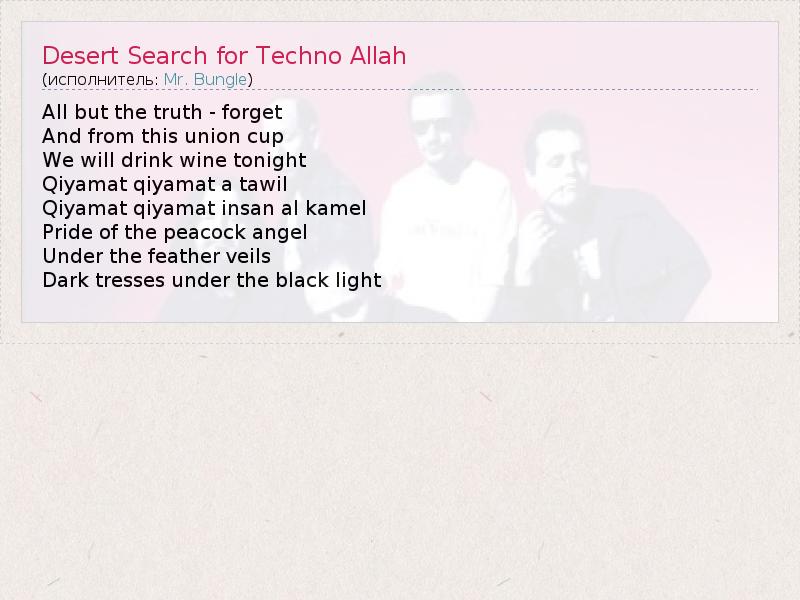 А как ты думаешь, о чем песня "Desert Search for Techno Allah" ?