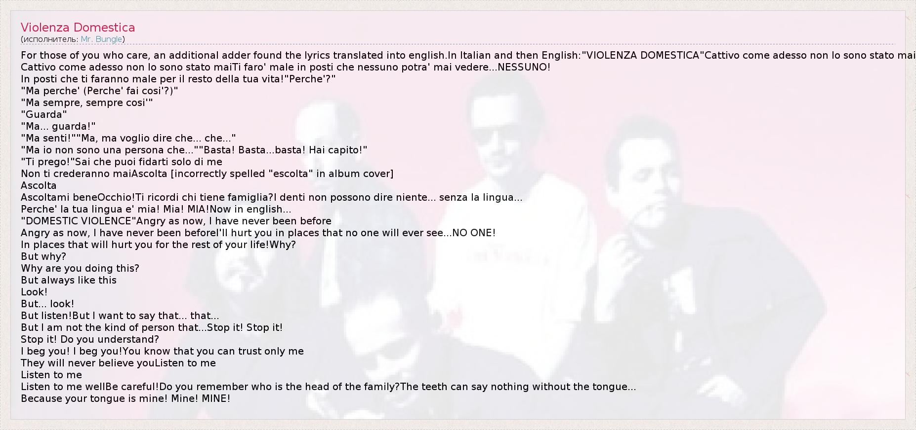 For those of you who care, an additional adder found the lyrics translated into english.In Italian and then English:"VIOLENZA DOMESTICA"Cattivo come adesso non lo sono stato mai