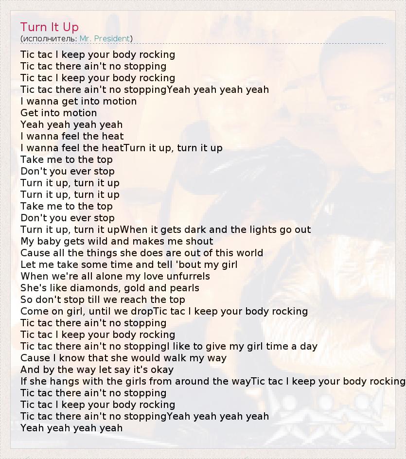 Tic tac I keep your body rocking Tic tac there ain't no stopping Tic tac I keep your body rocking Tic tac there ain't no stoppingYeah yeah yeah yeah I wanna get into motion Get into motion Yeah yeah yeah yeah I wanna feel the heat I wanna feel the heatTurn it up, turn it up Take me to the top Don't you ever stop Turn it up, turn it up Turn it up, turn it up Take me to the top Don't you ever stop Turn it up, turn it upWhen it gets dark and the lights go out My baby gets wild and makes me shout Cause all the things she does are out of this world Let me take some time and tell 'bout my girl When we're all alone my love unfurrels She's like diamonds, gold and pearls So don't stop till we reach the top Come on girl, until we dropTic tac I keep your body rocking Tic tac there ain't no stopping Tic tac I keep your body rocking Tic tac there ain't no stoppingI like to give my girl time a day Cause I know that she would walk my way And by the way let say it's okay If she hangs with the girls from around the wayTic tac I keep your body rocking Tic tac there ain't no stopping Tic tac I keep your body rocking Tic tac there ain't no stoppingYeah yeah yeah yeah Yeah yeah yeah yeah