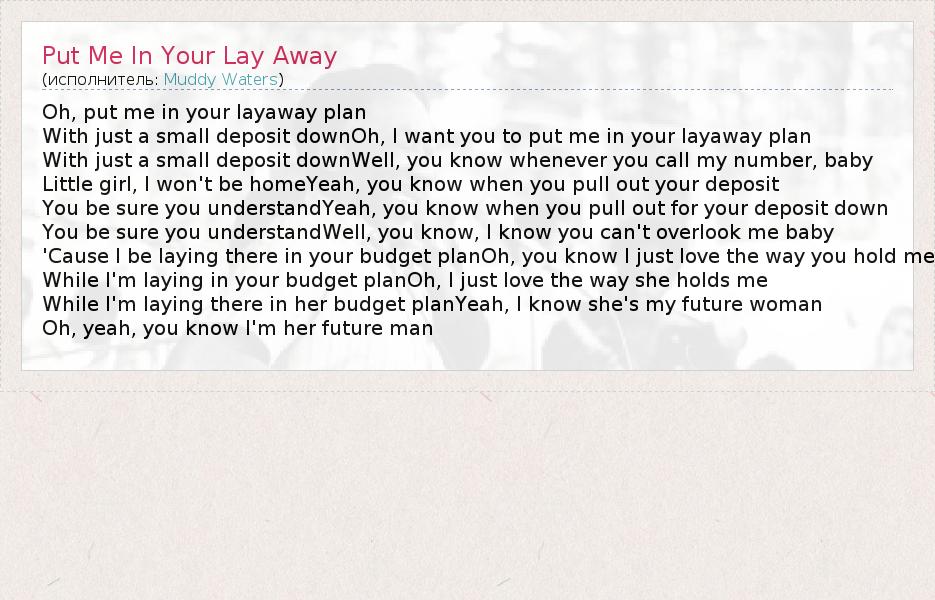 А как ты думаешь, о чем песня "Put Me In Your Lay Away" ?