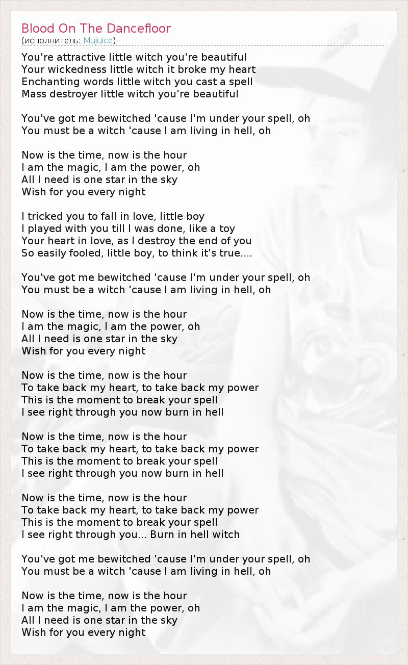 Ты притягательна, маленькая ведьмочка, ты красивая. Твоя злоба, маленькая ведьмочка, разбила мне сердце. Очаровывающими словами, маленькая ведьмочка, ты произнесла заклинание. Массовый уничтожитель, маленькая ведьмочка, ты красивая... Ты заколдовала меня, потому что я очарован тобой. Ты, наверное, ведьма, потому что я живу в аду. Сейчас самое подходящее время, сейчас самый подходящий час, Я – магия, я – сила. Всё, что мне нужно, – одна звезда в небе, Загадываю желание о тебе каждую ночь. Я обманом заставила тебя влюбиться, маленький мальчик, Я играла с тобой, пока не наигралась - как с игрушкой. Твоё сердце влюблено, в то время как я полностью тебя уничтожила. Тебя так легко одурачить, маленький мальчик, убедить, что это правда. Ты заколдовала меня, потому что я очарован тобой. Ты, наверное, ведьма, потому что я живу в аду. Сейчас самое подходящее время, сейчас самый подходящий час, Я – магия, я – сила. Всё, что мне нужно, – одна звезда в небе, Загадываю желание о тебе каждую ночь. Сейчас самое подходящее время, сейчас самый подходящий час Вернуть своё сердце, вернуть свою силу. Это самый подходящий момент разрушить твои чары. Я вижу тебя насквозь. Теперь гори в аду. Сейчас самое подходящее время, сейчас самый подходящий час Вернуть своё сердце, вернуть свою силу. Это самый подходящий момент разрушить твои чары. Я вижу тебя насквозь. Теперь гори в аду. Сейчас самое подходящее время, сейчас самый подходящий час Вернуть своё сердце, вернуть свою силу. Это самый подходящий момент разрушить твои чары. Я вижу тебя насквозь... Гори в аду, ведьма! Ты заколдовала меня, потому что я очарован тобой. Ты, наверное, ведьма, потому что я живу в аду. Сейчас самое подходящее время, сейчас самый подходящий час, Я – магия, я – сила. Всё, что мне нужно, – одна звезда в небе, Загадываю желание о тебе каждую ночь.