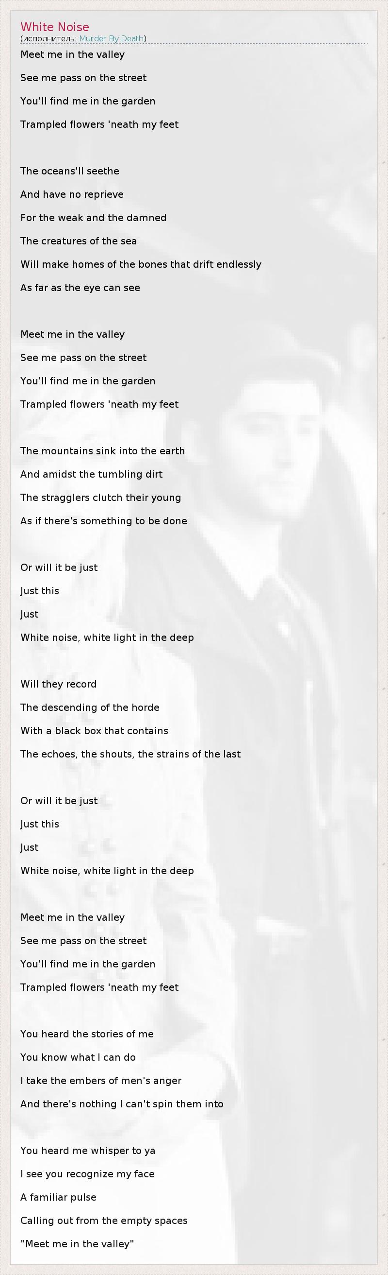 Meet me in the valley See me pass on the street You'll find me in the garden Trampled flowers 'neath my feet The oceans'll seethe And have no reprieve For the weak and the damned The creatures of the sea Will make homes of the bones that drift endlessly As far as the eye can see Meet me in the valley See me pass on the street You'll find me in the garden Trampled flowers 'neath my feet The mountains sink into the earth And amidst the tumbling dirt The stragglers clutch their young As if there's something to be done Or will it be just Just this Just White noise, white light in the deep Will they record The descending of the horde With a black box that contains The echoes, the shouts, the strains of the last Or will it be just Just this Just White noise, white light in the deep Meet me in the valley See me pass on the street You'll find me in the garden Trampled flowers 'neath my feet You heard the stories of me You know what I can do I take the embers of men's anger And there's nothing I can't spin them into You heard me whisper to ya I see you recognize my face A familiar pulse Calling out from the empty spaces "Meet me in the valley"