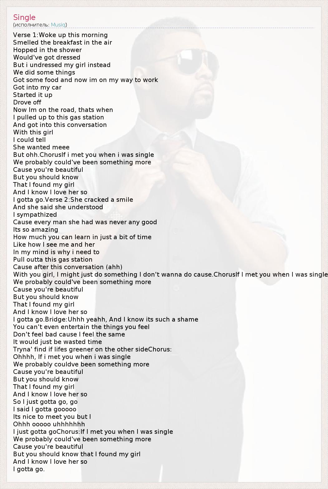 Verse 1:Woke up this morning Smelled the breakfast in the air Hopped in the shower Would've got dressed But i undressed my girl instead We did some things Got some food and now im on my way to work Got into my car Started it up Drove off Now Im on the road, thats when I pulled up to this gas station And got into this conversation With this girl I could tell She wanted meee But ohh.ChorusIf i met you when i was single We probably could've been something more Cause you're beautiful But you should know That I found my girl And I know I love her so I gotta go.Verse 2:She cracked a smile And she said she understood I sympathized Cause every man she had was never any good Its so amazing How much you can learn in just a bit of time Like how I see me and her In my mind is why i need to Pull outta this gas station Cause after this conversation (ahh) With you girl, I might just do something I don't wanna do cause.ChorusIf I met you when I was single We probably could've been something more Cause you're beautiful But you should know That I found my girl And I know I love her so I gotta go.Bridge:Uhhh yeahh, And I know its such a shame You can't even entertain the things you feel Don't feel bad cause I feel the same It would just be wasted time Tryna' find if lifes greener on the other sideChorus: Ohhhh, If i met you when i was single We probably couldve been something more Cause you're beautiful But you should know That I found my girl And I know I love her so So I just gotta go, go I said I gotta gooooo Its nice to meet you but I Ohhh ooooo uhhhhhhh I just gotta goChorus:If I met you when I was single We probably could've been something more Cause you're beautiful But you should know that I found my girl And I know I love her so I gotta go.