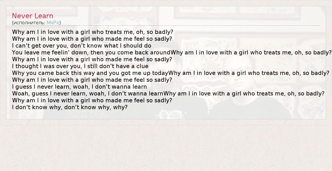 Why am I in love with a girl who treats me, oh, so badly? Why am I in love with a girl who made me feel so sadly? I can't get over you, don't know what I should do You leave me feelin' down, then you come back aroundWhy am I in love with a girl who treats me, oh, so badly? Why am I in love with a girl who made me feel so sadly? I thought I was over you, I still don't have a clue Why you came back this way and you got me up todayWhy am I in love with a girl who treats me, oh, so badly? Why am I in love with a girl who made me feel so sadly? I guess I never learn, woah, I don't wanna learn Woah, guess I never learn, woah, I don't wanna learnWhy am I in love with a girl who treats me, oh, so badly? Why am I in love with a girl who made me feel so sadly? I don't know why, don't know why, why?