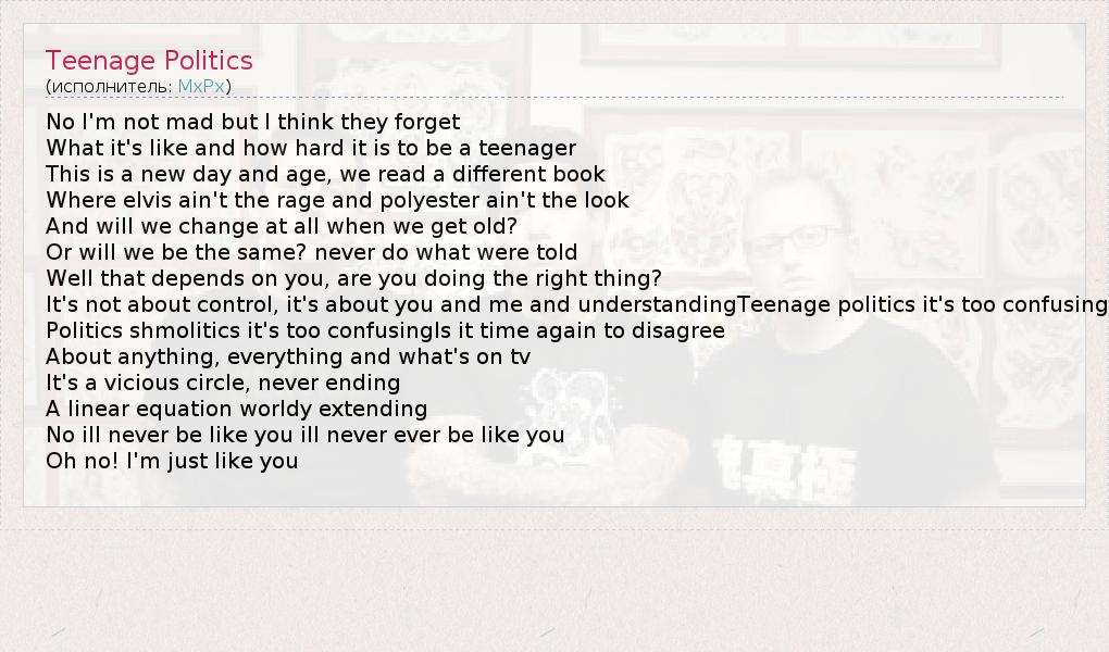 А как ты думаешь, о чем песня "Teenage Politics" ?