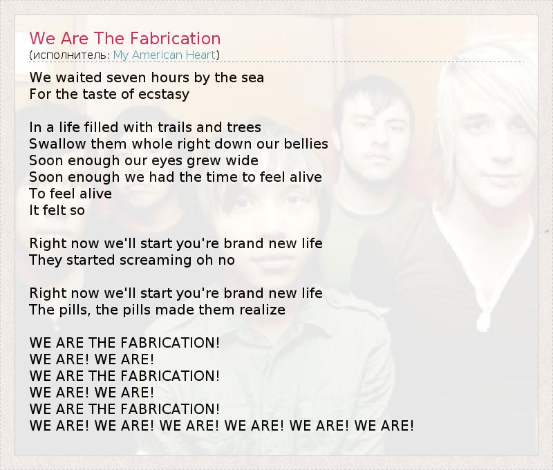 We waited seven hours by the sea For the taste of ecstasy In a life filled with trails and trees Swallow them whole right down our bellies Soon enough our eyes grew wide Soon enough we had the time to feel alive To feel alive It felt so Right now we'll start you're brand new life They started screaming oh no Right now we'll start you're brand new life The pills, the pills made them realize WE ARE THE FABRICATION! WE ARE! WE ARE! WE ARE THE FABRICATION! WE ARE! WE ARE! WE ARE THE FABRICATION! WE ARE! WE ARE! WE ARE! WE ARE! WE ARE! WE ARE!