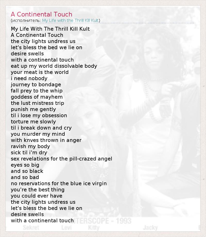 Это интересно:Можно долго рассуждать о том, что же на самом деле представляют из себя My Life With the Thrill Kill Kult (TKK), но очевидно, что с полной уверенностью можно сказать лишь о том, что эта команда была образована в Чикаго. Остальное требует более подробного рассмотрения.Итак, где-то в 1987 году в Чикаго познакомились только что переехавшие из Бостона музыкант Buzz McCoy (настоящее имя Marston Daley) и поэт/художник/певец... продолжение