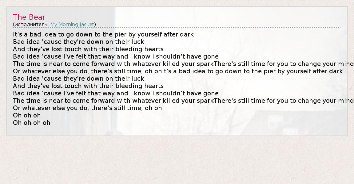 Это интересно:My Morning Jacket – динозавры с десятилетней историей, на малой родине в Луисвилле, да и вообще в США их числят в «монстрах рока». То, что ты это название видишь впервые, объясняется тем, что парни звучат слишком по-американски: наверное, так же трудно вывести на мировой рынок группу «Чайф» с их «сибирскими ламбадушками». Поклонники (в их числе, к слову, известный меломан Камерон Кроу, который пригласил... продолжение