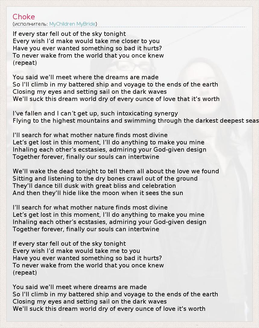 Если каждая звезда упала с неба сегодня вечером Каждый хотел бы я сделать бы меня ближе к вам Вы никогда не хотели -то так плохо это больно ? Чтобы никогда не проснуться от мира , что вы когда-то знал ( повтор) Вы сказали, что мы встретимся , где мечты сделаны Так что я буду лезть в моей разрушенной корабля и плавания к концам земли Закрыв глаза и отправиться в плавание на темных волн Мы сосать эту мечту мировой сухой каждой унции любви , что это стоит Я упал , и я не могу встать , такой опьяняющий синергии Полет в самых высоких гор и купание в самые мрачные глубоких морей Я буду искать для того, что мать-природа находит самый божественный Давайте потерял в этот момент, я сделаю все, чтобы вы мои Вдыхая восторги друг друга , любуясь свой Богом данный дизайн Вместе навсегда , наконец наши души могут переплетаться Мы разбудить мертвых сегодня вечером, чтобы сказать им, все о любви , мы обнаружили, Сидя и слушая сухих костей выползают из земли Они буду танцевать до рассвета с великого блаженства и празднования И тогда они будут скрывать , как луна , когда она видит солнце Я буду искать для того, что мать-природа находит самый божественный Давайте потерял в этот момент, я сделаю все, чтобы вы мои Вдыхая восторги друг друга , любуясь свой Богом данный дизайн Вместе навсегда , наконец наши души могут переплетаться Если каждая звезда упала с неба сегодня вечером Каждый хотел бы я сделать бы меня к вам Вы никогда не хотели -то так плохо это больно ? Чтобы никогда не проснуться от мира , что вы когда-то знал ( повтор) Вы сказали, что мы встретимся , где мечты сделаны Так что я буду лезть в моей разрушенной корабля и плавания к концам земли Закрыв глаза и отправиться в плавание на темных волн Мы сосать эту мечту мировой сухой каждой унции любви это стоит