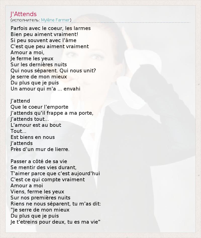 Parfois avec le coeur, les larmes Bien peu aiment vraiment! Si peu souvent avec l'âme C'est que peu aiment vraiment Amour а moi, Je ferme les yeux Sur les dernières nuits Qui nous séparent. Qui nous unit? Je serre de mon mieux Du plus que je puis Un amour qui m'a ... envahi J'attend Que le coeur l'emporte J'attends qu'il frappe а ma porte, J'attends tout... L'amour est au bout Tout... Est biens en nous J'attends Près d'un mur de lierre. Passer a côté de sa vie Se mentir des vies durant, T'aimer parce que c'est aujourd'hui C'est ce qui compte vraiment Amour a moi Viens, ferme les yeux Sur nos premières nuits Riens ne nous séparent, tu m'as dit: "Je serre de mon mieux Du plus que je puis Je t'etreins pour deux, tu es ma vie"