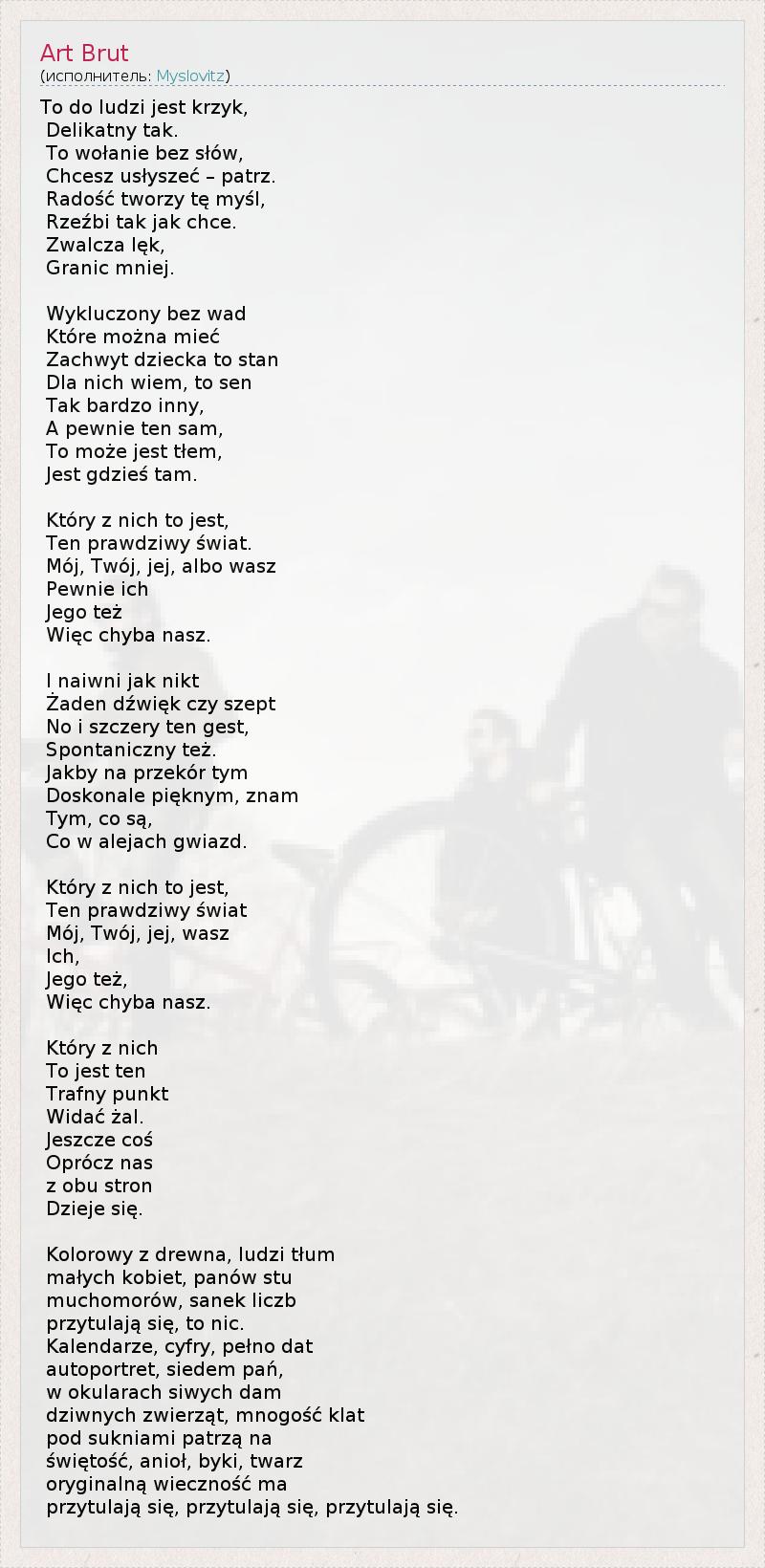 To do ludzi jest krzyk, Delikatny tak. To wołanie bez słów, Chcesz usłyszeć – patrz. Radość tworzy tę myśl, Rzeźbi tak jak chce. Zwalcza lęk, Granic mniej. Wykluczony bez wad Które można mieć Zachwyt dziecka to stan Dla nich wiem, to sen Tak bardzo inny, A pewnie ten sam, To może jest tłem, Jest gdzieś tam. Który z nich to jest, Ten prawdziwy świat. Mój, Twój, jej, albo wasz Pewnie ich Jego też Więc chyba nasz. I naiwni jak nikt Żaden dźwięk czy szept No i szczery ten gest, Spontaniczny też. Jakby na przekór tym Doskonale pięknym, znam Tym, co są, Co w alejach gwiazd. Który z nich to jest, Ten prawdziwy świat Mój, Twój, jej, wasz Ich, Jego też, Więc chyba nasz. Który z nich To jest ten Trafny punkt Widać żal. Jeszcze coś Oprócz nas z obu stron Dzieje się. Kolorowy z drewna, ludzi tłum małych kobiet, panów stu muchomorów, sanek liczb przytulają się, to nic. Kalendarze, cyfry, pełno dat autoportret, siedem pań, w okularach siwych dam dziwnych zwierząt, mnogość klat pod sukniami patrzą na świętość, anioł, byki, twarz oryginalną wieczność ma przytulają się, przytulają się, przytulają się.