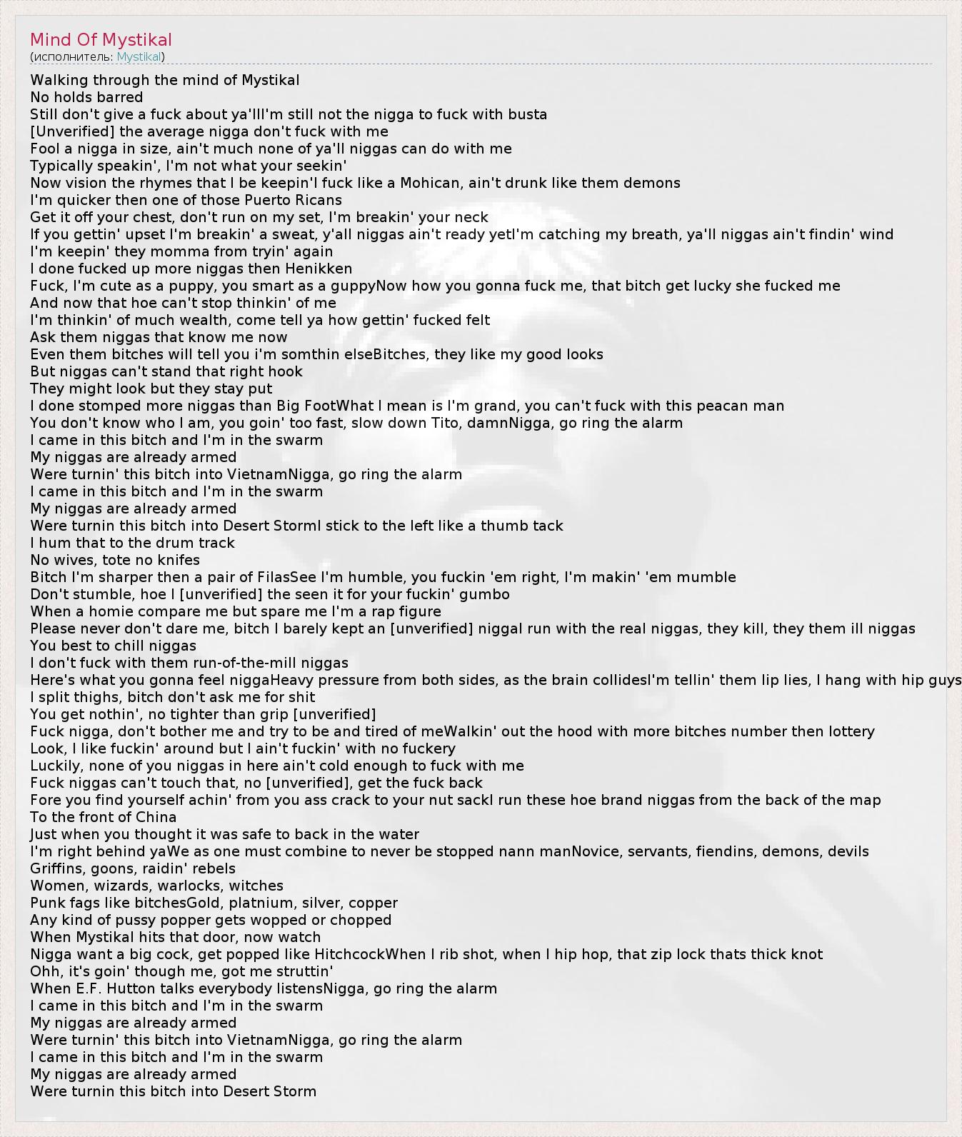 Walking through the mind of Mystikal No holds barred Still don't give a fuck about ya'llI'm still not the nigga to fuck with busta [Unverified] the average nigga don't fuck with me Fool a nigga in size, ain't much none of ya'll niggas can do with me Typically speakin', I'm not what your seekin' Now vision the rhymes that I be keepin'I fuck like a Mohican, ain't drunk like them demons I'm quicker then one of those Puerto Ricans Get it off your chest, don't run on my set, I'm breakin' your neck If you gettin' upset I'm breakin' a sweat, y'all niggas ain't ready yetI'm catching my breath, ya'll niggas ain't findin' wind I'm keepin' they momma from tryin' again I done fucked up more niggas then Henikken Fuck, I'm cute as a puppy, you smart as a guppyNow how you gonna fuck me, that bitch get lucky she fucked me And now that hoe can't stop thinkin' of me I'm thinkin' of much wealth, come tell ya how gettin' fucked felt Ask them niggas that know me now Even them bitches will tell you i'm somthin elseBitches, they like my good looks But niggas can't stand that right hook They might look but they stay put I done stomped more niggas than Big FootWhat I mean is I'm grand, you can't fuck with this peacan man You don't know who I am, you goin' too fast, slow down Tito, damnNigga, go ring the alarm I came in this bitch and I'm in the swarm My niggas are already armed Were turnin' this bitch into VietnamNigga, go ring the alarm I came in this bitch and I'm in the swarm My niggas are already armed Were turnin this bitch into Desert StormI stick to the left like a thumb tack I hum that to the drum track No wives, tote no knifes Bitch I'm sharper then a pair of FilasSee I'm humble, you fuckin 'em right, I'm makin' 'em mumble Don't stumble, hoe I [unverified] the seen it for your fuckin' gumbo When a homie compare me but spare me I'm a rap figure Please never don't dare me, bitch I barely kept an [unverified] niggaI run with the real niggas, they kill, they them ill niggas You best to chill niggas I don't fuck with them run-of-the-mill niggas Here's what you gonna feel niggaHeavy pressure from both sides, as the brain collidesI'm tellin' them lip lies, I hang with hip guys I split thighs, bitch don't ask me for shit You get nothin', no tighter than grip [unverified] Fuck nigga, don't bother me and try to be and tired of meWalkin' out the hood with more bitches number then lottery Look, I like fuckin' around but I ain't fuckin' with no fuckery Luckily, none of you niggas in here ain't cold enough to fuck with me Fuck niggas can't touch that, no [unverified], get the fuck back Fore you find yourself achin' from you ass crack to your nut sackI run these hoe brand niggas from the back of the map To the front of China Just when you thought it was safe to back in the water I'm right behind yaWe as one must combine to never be stopped nann manNovice, servants, fiendins, demons, devils Griffins, goons, raidin' rebels Women, wizards, warlocks, witches Punk fags like bitchesGold, platnium, silver, copper Any kind of pussy popper gets wopped or chopped When Mystikal hits that door, now watch Nigga want a big cock, get popped like HitchcockWhen I rib shot, when I hip hop, that zip lock thats thick knot Ohh, it's goin' though me, got me struttin' When E.F. Hutton talks everybody listensNigga, go ring the alarm I came in this bitch and I'm in the swarm My niggas are already armed Were turnin' this bitch into VietnamNigga, go ring the alarm I came in this bitch and I'm in the swarm My niggas are already armed Were turnin this bitch into Desert Storm