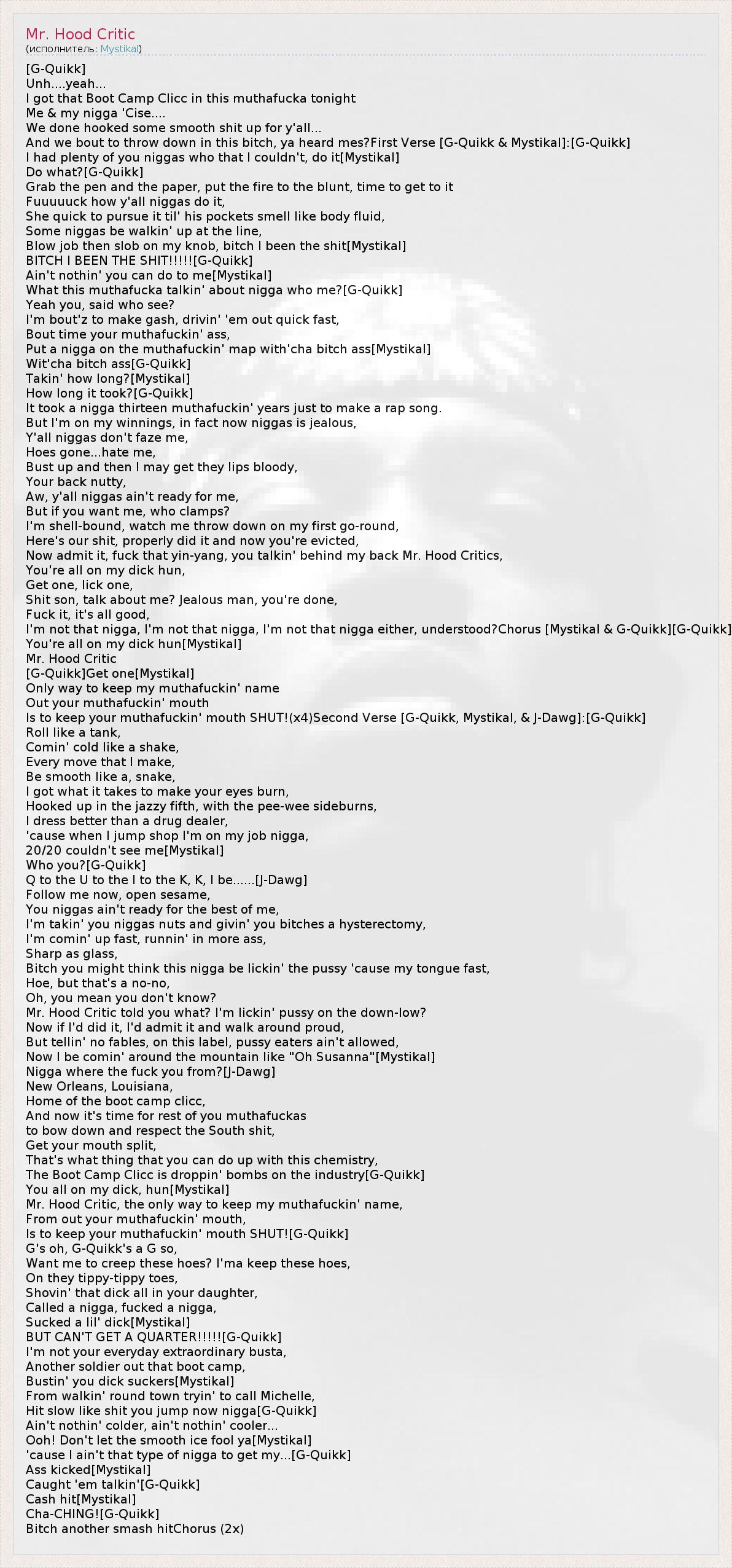 [G-Quikk] Unh....yeah... I got that Boot Camp Clicc in this muthafucka tonight Me & my nigga 'Cise.... We done hooked some smooth shit up for y'all... And we bout to throw down in this bitch, ya heard mes?First Verse [G-Quikk & Mystikal]:[G-Quikk] I had plenty of you niggas who that I couldn't, do it[Mystikal] Do what?[G-Quikk] Grab the pen and the paper, put the fire to the blunt, time to get to it Fuuuuuck how y'all niggas do it, She quick to pursue it til' his pockets smell like body fluid, Some niggas be walkin' up at the line, Blow job then slob on my knob, bitch I been the shit[Mystikal] BITCH I BEEN THE SHIT!!!!![G-Quikk] Ain't nothin' you can do to me[Mystikal] What this muthafucka talkin' about nigga who me?[G-Quikk] Yeah you, said who see? I'm bout'z to make gash, drivin' 'em out quick fast, Bout time your muthafuckin' ass, Put a nigga on the muthafuckin' map with'cha bitch ass[Mystikal] Wit'cha bitch ass[G-Quikk] Takin' how long?[Mystikal] How long it took?[G-Quikk] It took a nigga thirteen muthafuckin' years just to make a rap song. But I'm on my winnings, in fact now niggas is jealous, Y'all niggas don't faze me, Hoes gone...hate me, Bust up and then I may get they lips bloody, Your back nutty, Aw, y'all niggas ain't ready for me, But if you want me, who clamps? I'm shell-bound, watch me throw down on my first go-round, Here's our shit, properly did it and now you're evicted, Now admit it, fuck that yin-yang, you talkin' behind my back Mr. Hood Critics, You're all on my dick hun, Get one, lick one, Shit son, talk about me? Jealous man, you're done, Fuck it, it's all good, I'm not that nigga, I'm not that nigga, I'm not that nigga either, understood?Chorus [Mystikal & G-Quikk][G-Quikk] You're all on my dick hun[Mystikal] Mr. Hood Critic [G-Quikk]Get one[Mystikal] Only way to keep my muthafuckin' name Out your muthafuckin' mouth Is to keep your muthafuckin' mouth SHUT!(x4)Second Verse [G-Quikk, Mystikal, & J-Dawg]:[G-Quikk] Roll like a tank, Comin' cold like a shake, Every move that I make, Be smooth like a, snake, I got what it takes to make your eyes burn, Hooked up in the jazzy fifth, with the pee-wee sideburns, I dress better than a drug dealer, 'cause when I jump shop I'm on my job nigga, 20/20 couldn't see me[Mystikal] Who you?[G-Quikk] Q to the U to the I to the K, K, I be......[J-Dawg] Follow me now, open sesame, You niggas ain't ready for the best of me, I'm takin' you niggas nuts and givin' you bitches a hysterectomy, I'm comin' up fast, runnin' in more ass, Sharp as glass, Bitch you might think this nigga be lickin' the pussy 'cause my tongue fast, Hoe, but that's a no-no, Oh, you mean you don't know? Mr. Hood Critic told you what? I'm lickin' pussy on the down-low? Now if I'd did it, I'd admit it and walk around proud, But tellin' no fables, on this label, pussy eaters ain't allowed, Now I be comin' around the mountain like "Oh Susanna"[Mystikal] Nigga where the fuck you from?[J-Dawg] New Orleans, Louisiana, Home of the boot camp clicc, And now it's time for rest of you muthafuckas to bow down and respect the South shit, Get your mouth split, That's what thing that you can do up with this chemistry, The Boot Camp Clicc is droppin' bombs on the industry[G-Quikk] You all on my dick, hun[Mystikal] Mr. Hood Critic, the only way to keep my muthafuckin' name, From out your muthafuckin' mouth, Is to keep your muthafuckin' mouth SHUT![G-Quikk] G's oh, G-Quikk's a G so, Want me to creep these hoes? I'ma keep these hoes, On they tippy-tippy toes, Shovin' that dick all in your daughter, Called a nigga, fucked a nigga, Sucked a lil' dick[Mystikal] BUT CAN'T GET A QUARTER!!!!![G-Quikk] I'm not your everyday extraordinary busta, Another soldier out that boot camp, Bustin' you dick suckers[Mystikal] From walkin' round town tryin' to call Michelle, Hit slow like shit you jump now nigga[G-Quikk] Ain't nothin' colder, ain't nothin' cooler... Ooh! Don't let the smooth ice fool ya[Mystikal] 'cause I ain't that type of nigga to get my...[G-Quikk] Ass kicked[Mystikal] Caught 'em talkin'[G-Quikk] Cash hit[Mystikal] Cha-CHING![G-Quikk] Bitch another smash hitChorus (2x)