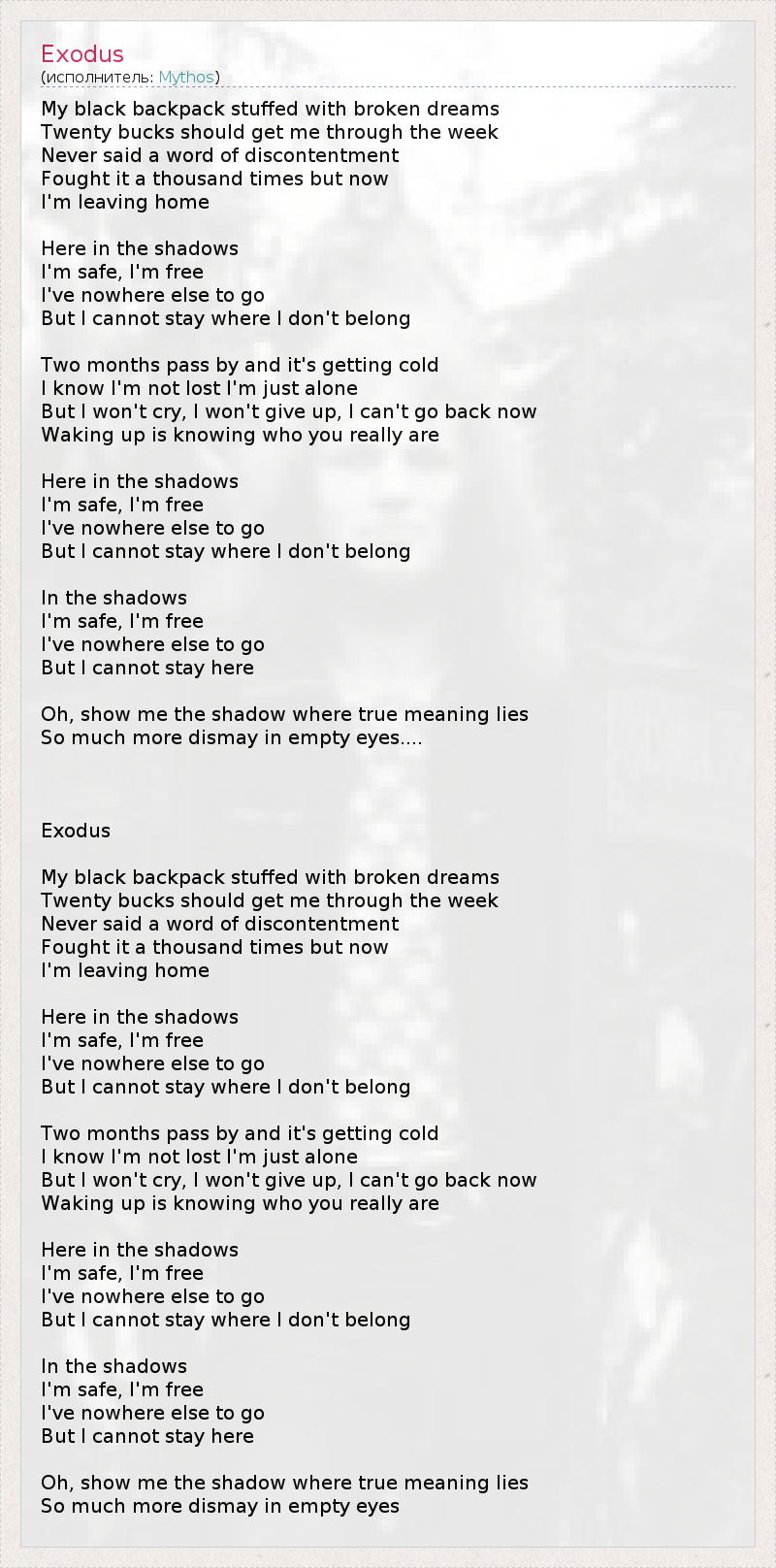 My black backpack stuffed with broken dreams Twenty bucks should get me through the week Never said a word of discontentment Fought it a thousand times but now I'm leaving home Here in the shadows I'm safe, I'm free I've nowhere else to go But I cannot stay where I don't belong Two months pass by and it's getting cold I know I'm not lost I'm just alone But I won't cry, I won't give up, I can't go back now Waking up is knowing who you really are Here in the shadows I'm safe, I'm free I've nowhere else to go But I cannot stay where I don't belong In the shadows I'm safe, I'm free I've nowhere else to go But I cannot stay here Oh, show me the shadow where true meaning lies So much more dismay in empty eyes.... Exodus My black backpack stuffed with broken dreams Twenty bucks should get me through the week Never said a word of discontentment Fought it a thousand times but now I'm leaving home Here in the shadows I'm safe, I'm free I've nowhere else to go But I cannot stay where I don't belong Two months pass by and it's getting cold I know I'm not lost I'm just alone But I won't cry, I won't give up, I can't go back now Waking up is knowing who you really are Here in the shadows I'm safe, I'm free I've nowhere else to go But I cannot stay where I don't belong In the shadows I'm safe, I'm free I've nowhere else to go But I cannot stay here Oh, show me the shadow where true meaning lies So much more dismay in empty eyes