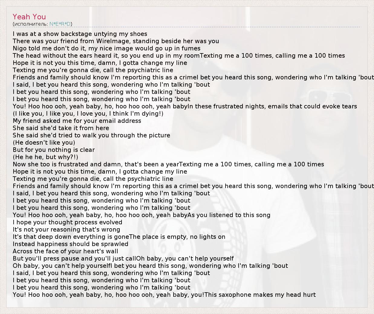 I was at a show backstage untying my shoes There was your friend from WireImage, standing beside her was you Nigo told me don't do it, my nice image would go up in fumes The head without the ears heard it, so you end up in my roomTexting me a 100 times, calling me a 100 times Hope it is not you this time, damn, I gotta change my line Texting me you're gonna die, call the psychiatric line Friends and family should know I'm reporting this as a crimeI bet you heard this song, wondering who I'm talking 'bout I said, I bet you heard this song, wondering who I'm talking 'bout I bet you heard this song, wondering who I'm talking 'bout I bet you heard this song, wondering who I'm talking 'bout You! Hoo hoo ooh, yeah baby, ho, hoo hoo ooh, yeah babyIn these frustrated nights, emails that could evoke tears (I like you, I like you, I love you, I think I'm dying!) My friend asked me for your email address She said she'd take it from here She said she'd tried to walk you through the picture (He doesn't like you) But for you nothing is clear (He he he, but why?!) Now she too is frustrated and damn, that's been a yearTexting me a 100 times, calling me a 100 times Hope it is not you this time, damn, I gotta change my line Texting me you're gonna die, call the psychiatric line Friends and family should know I'm reporting this as a crimeI bet you heard this song, wondering who I'm talking 'bout I said, I bet you heard this song, wondering who I'm talking 'bout I bet you heard this song, wondering who I'm talking 'bout I bet you heard this song, wondering who I'm talking 'bout You! Hoo hoo ooh, yeah baby, ho, hoo hoo ooh, yeah babyAs you listened to this song I hope your thought process evolved It's not your reasoning that's wrong It's that deep down everything is goneThe place is empty, no lights on Instead happiness should be sprawled Across the face of your heart's wall But you'll press pause and you'll just callOh baby, you can't help yourself Oh baby, you can't help yourselfI bet you heard this song, wondering who I'm talking 'bout I said, I bet you heard this song, wondering who I'm talking 'bout I bet you heard this song, wondering who I'm talking 'bout I bet you heard this song, wondering who I'm talking 'bout You! Hoo hoo ooh, yeah baby, ho, hoo hoo ooh, yeah baby, you!This saxophone makes my head hurt