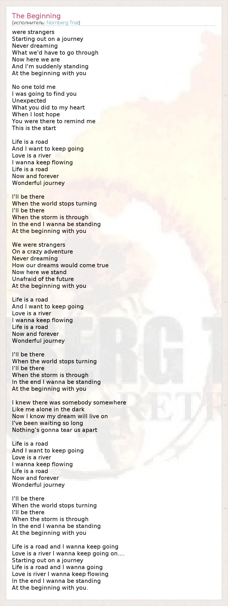 were strangers Starting out on a journey Never dreaming What we'd have to go through Now here we are And I'm suddenly standing At the beginning with you No one told me I was going to find you Unexpected What you did to my heart When I lost hope You were there to remind me This is the start Life is a road And I want to keep going Love is a river I wanna keep flowing Life is a road Now and forever Wonderful journey I'll be there When the world stops turning I'll be there When the storm is through In the end I wanna be standing At the beginning with you We were strangers On a crazy adventure Never dreaming How our dreams would come true Now here we stand Unafraid of the future At the beginning with you Life is a road And I want to keep going Love is a river I wanna keep flowing Life is a road Now and forever Wonderful journey I'll be there When the world stops turning I'll be there When the storm is through In the end I wanna be standing At the beginning with you I knew there was somebody somewhere Like me alone in the dark Now I know my dream will live on I've been waiting so long Nothing's gonna tear us apart Life is a road And I want to keep going Love is a river I wanna keep flowing Life is a road Now and forever Wonderful journey I'll be there When the world stops turning I'll be there When the storm is through In the end I wanna be standing At the beginning with you Life is a road and I wanna keep going Love is a river I wanna keep going on.... Starting out on a journey Life is a road and I wanna going Love is river I wanna keep flowing In the end I wanna be standing At the beginning with you.